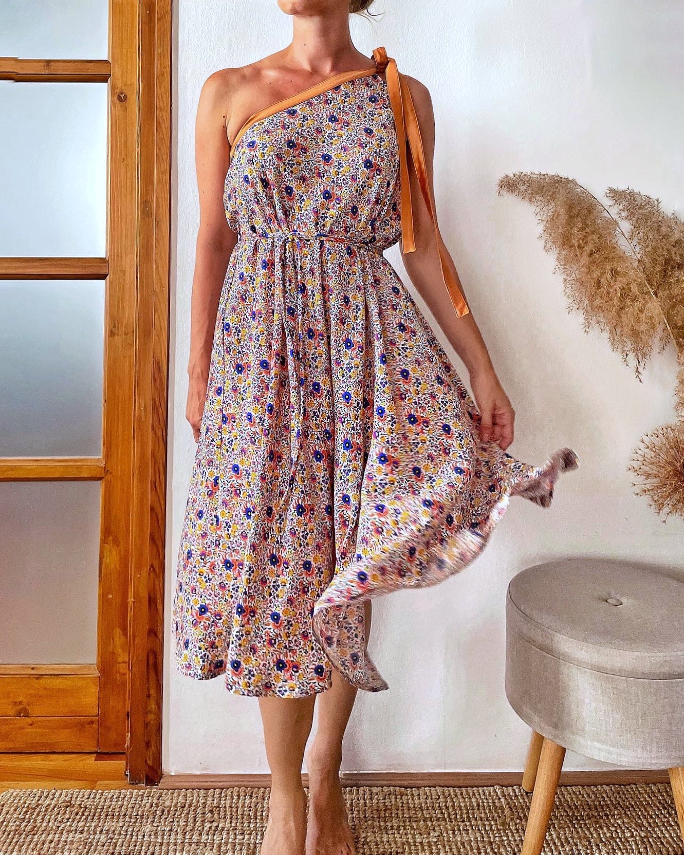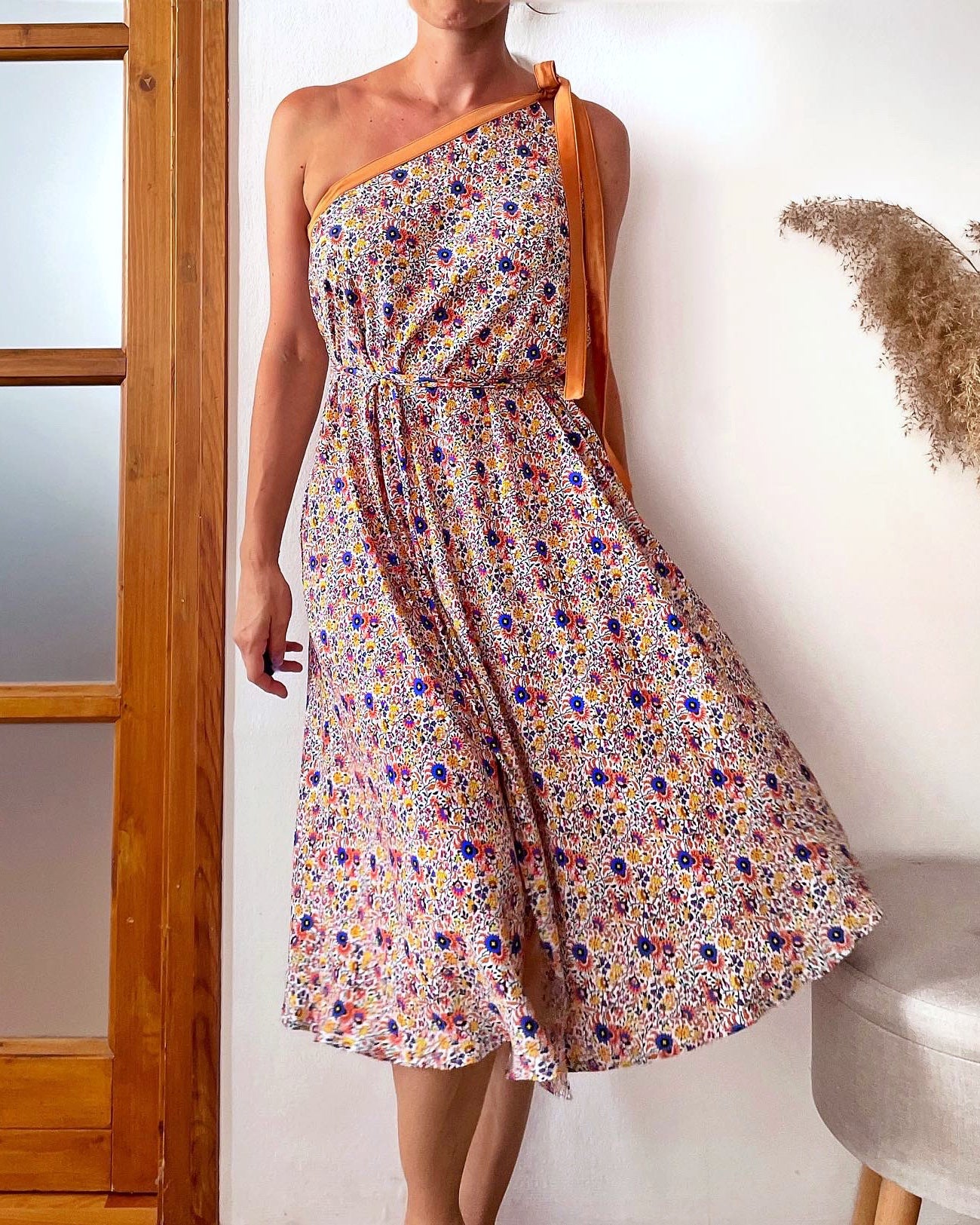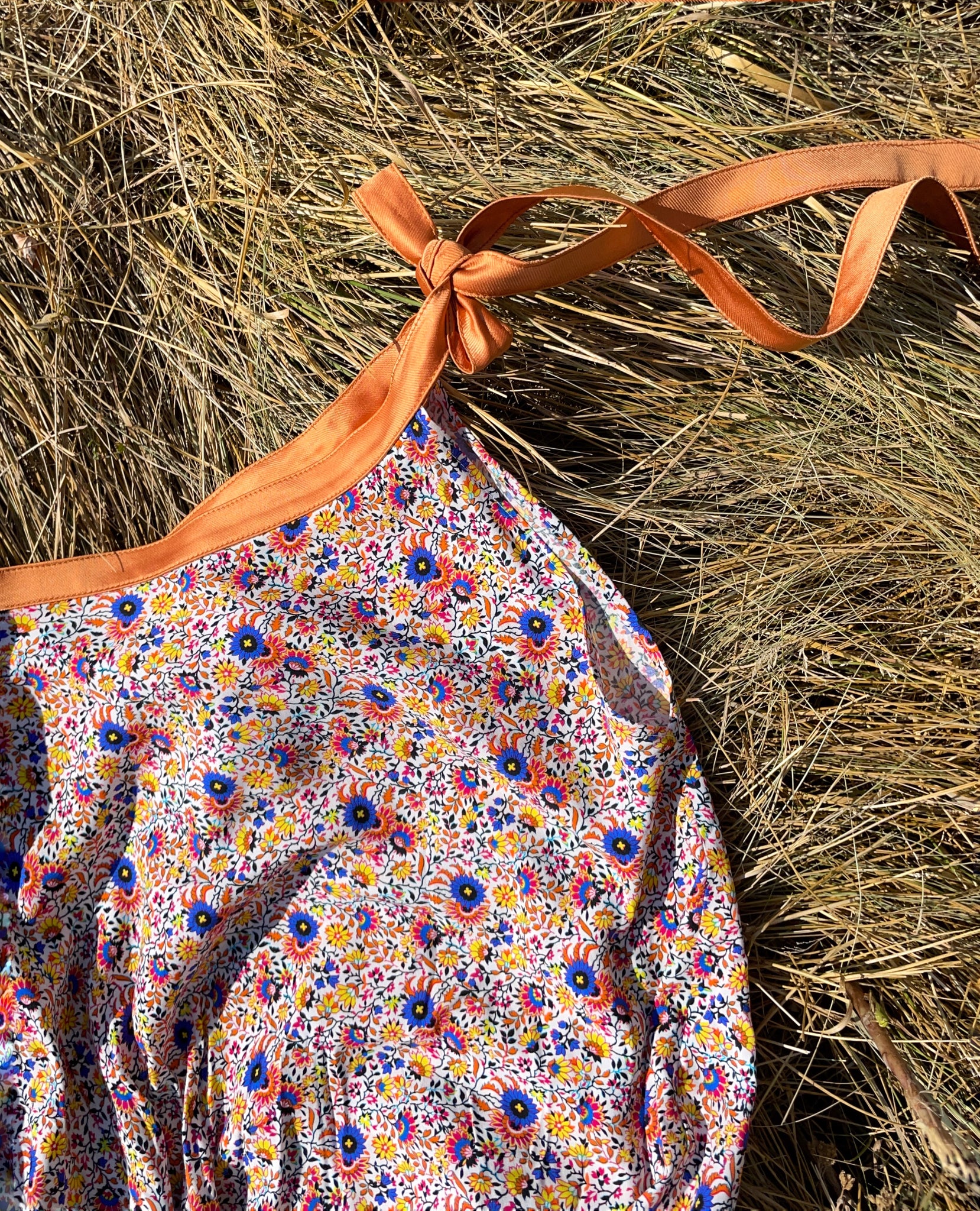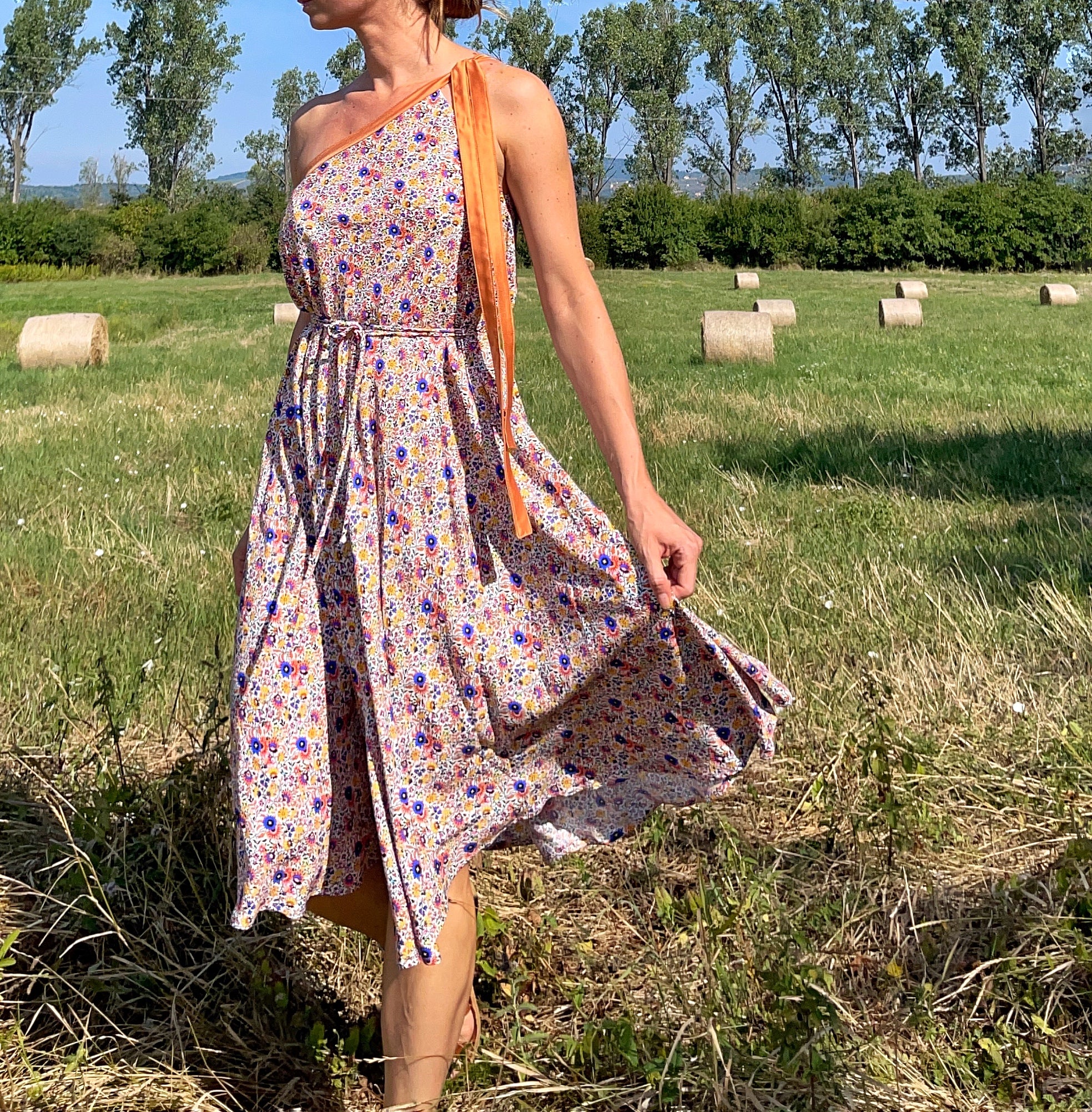 Félvállas, lefele bővülő pörgős fazon. Elől egyenes hasítékkal. Szatén vállpántokkal.