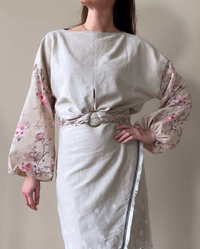 Test natúr lenvászon, ujj buggyos viragos vekony pamut batiszt.