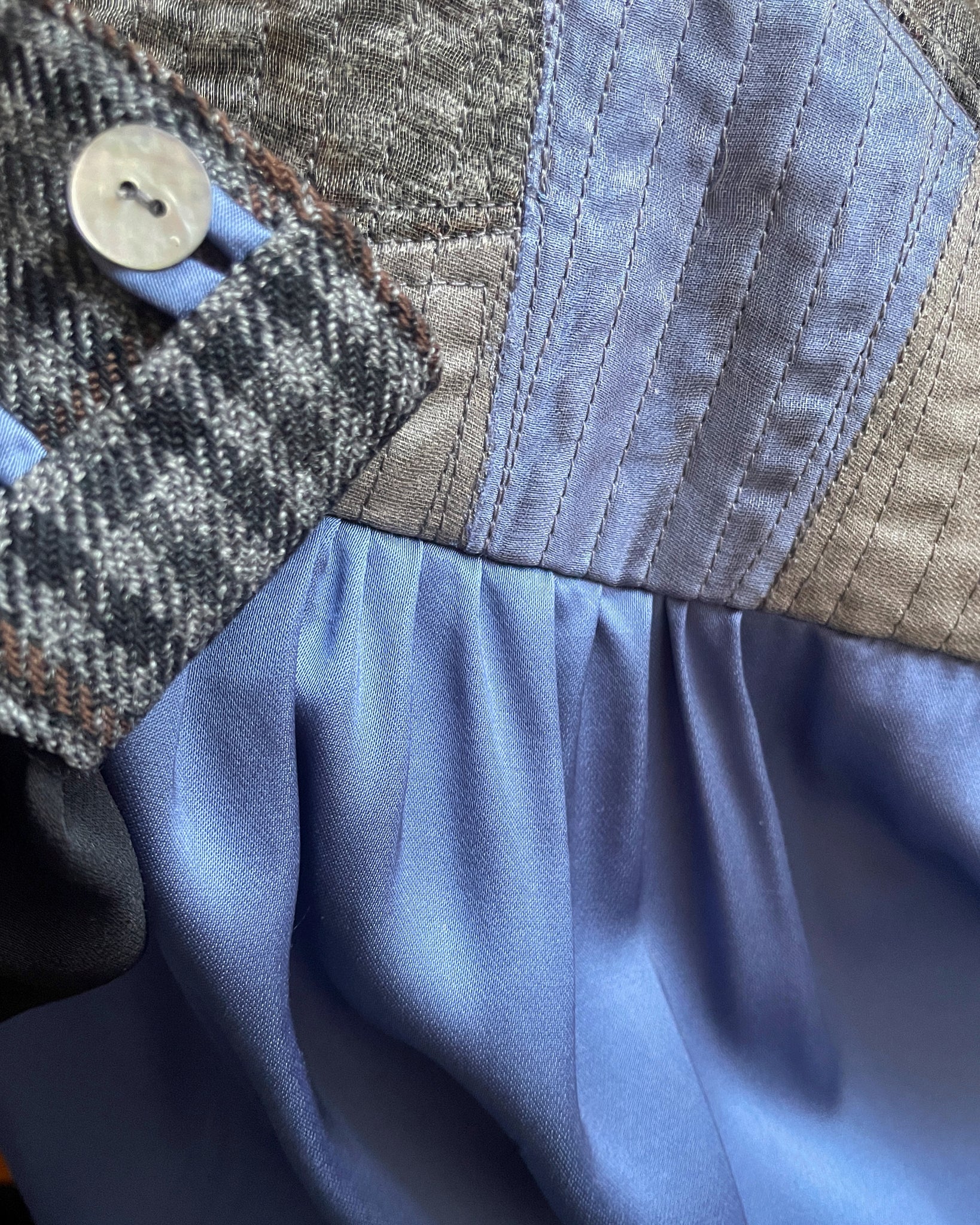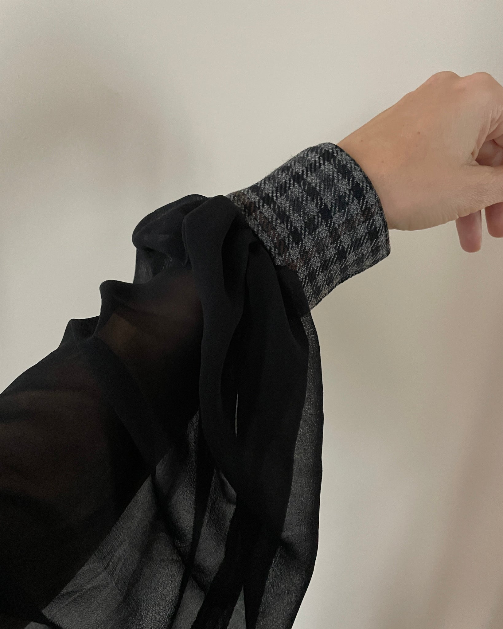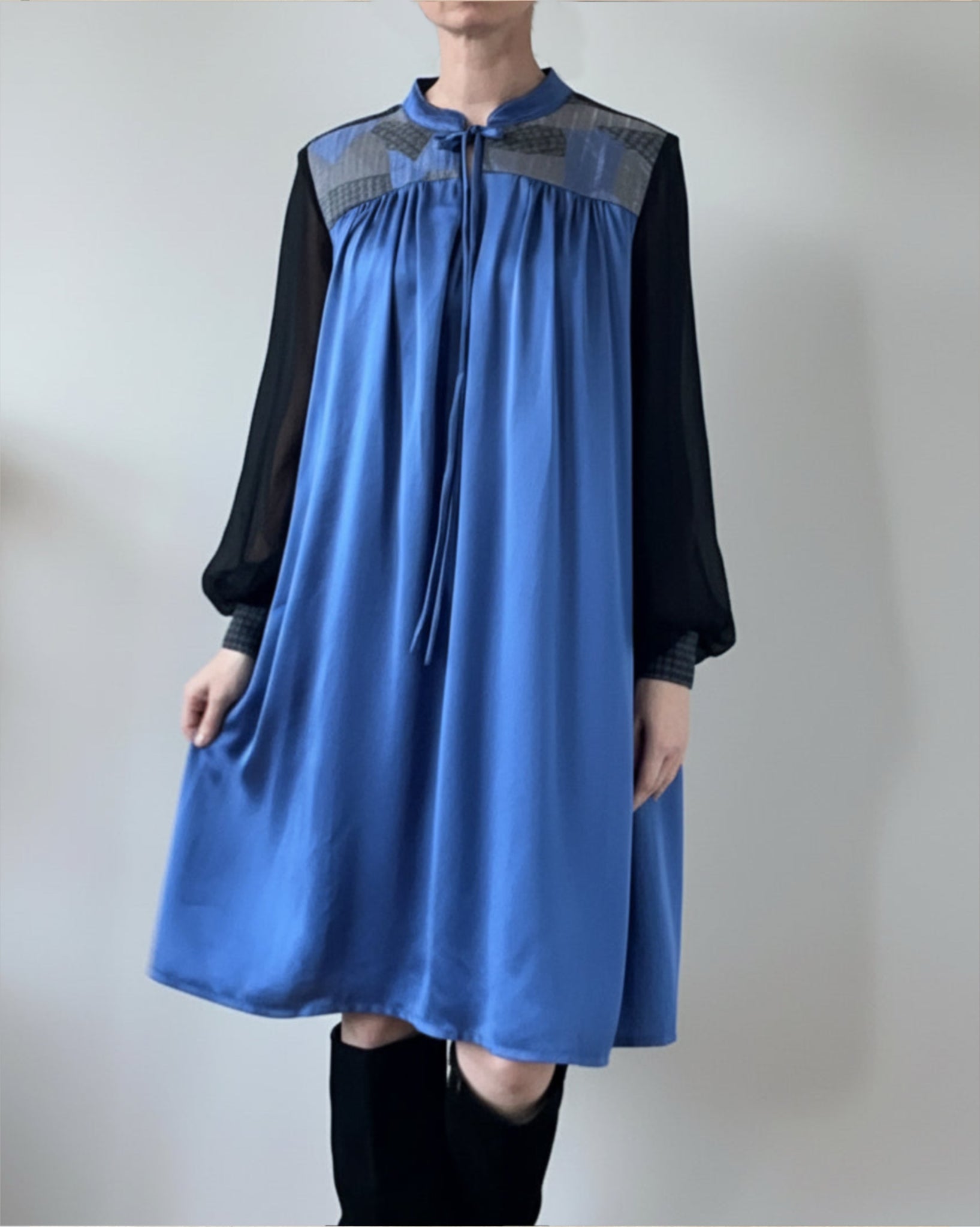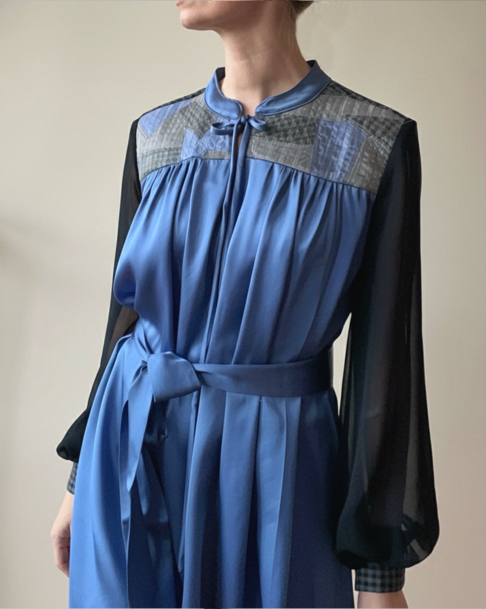 Egyméretes, mellben húzott mini ruha. A váll rész saját steppelt technikával, anyagmaradékokből készült patchwork elem. A háta vállrész és a kézelő újrahasznasított tweed zakóból készült, ami a patchwork váll elemben is visszaköszön. Ujja áttetsző buggyos fekete muszlin. Derékkötője levehető.
