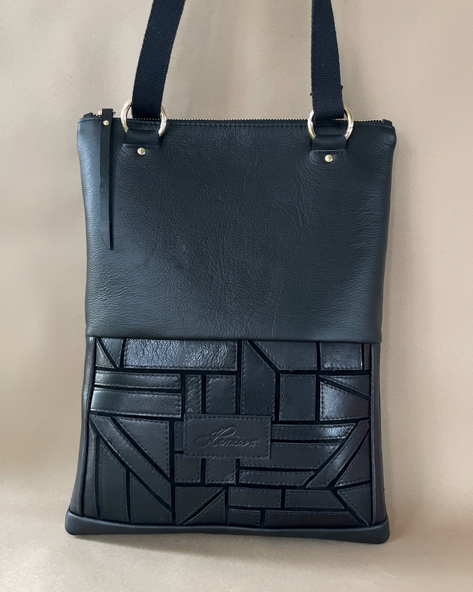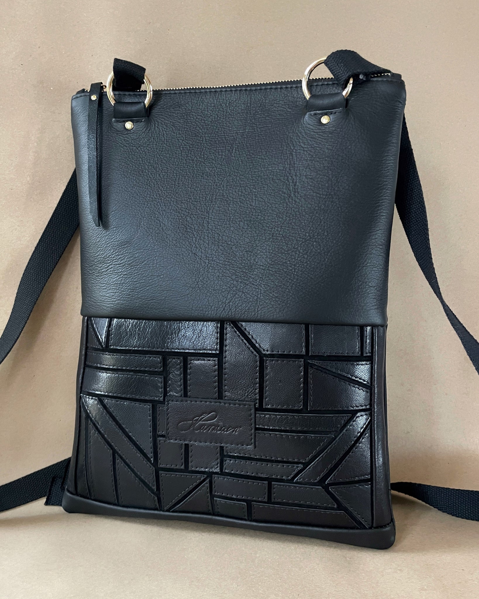 Ez a darab elől fekete színbőr, fekete velúrbőrön fekete geometrikus mozaikkal díszítve, hátoldala fekete színbőr. A Zipper fazonok hátiként, vagy a pántokat átcsatolva oldaltáskaként is használható.