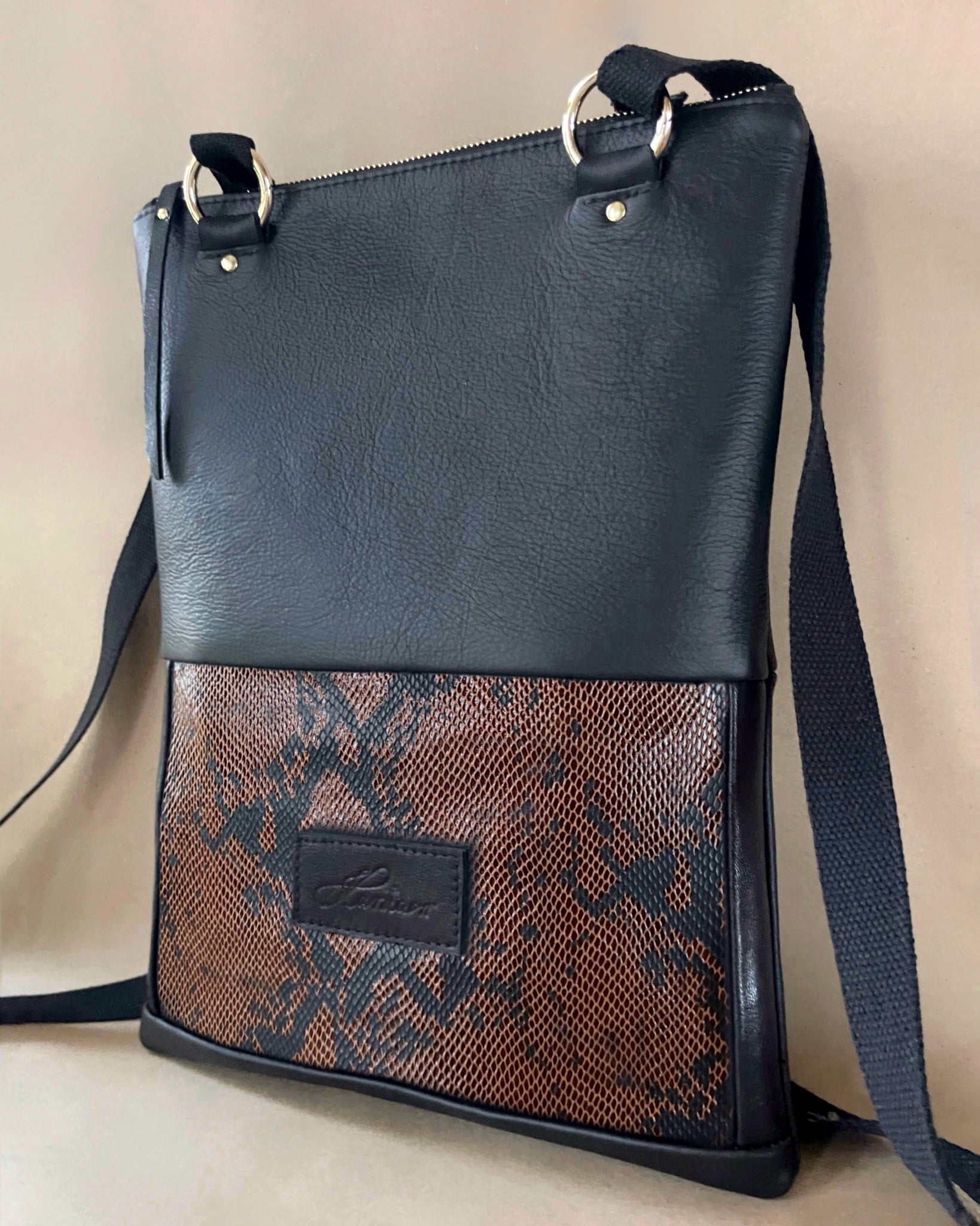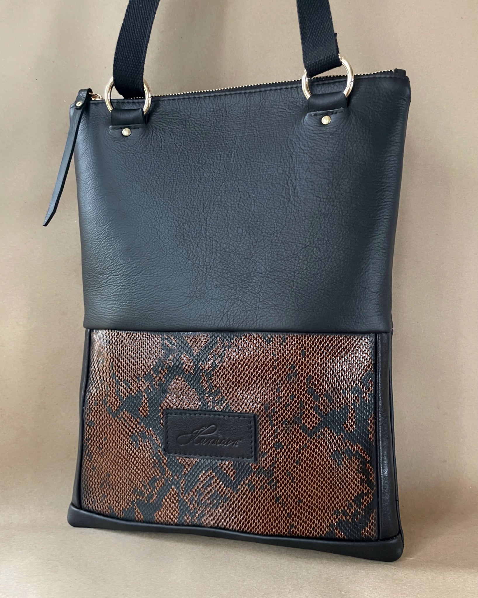 Ez a darab fekete marhabőr és barna fekete állatmintás bőrrel kombinálva, hátoldala színbőr. Heveder vállpántokkal. A Zipper fazonok hátiként, vagy a nyitható karikákkal a pántokat átcsatolva oldaltáskaként is használhatók.