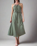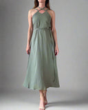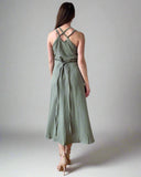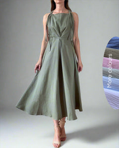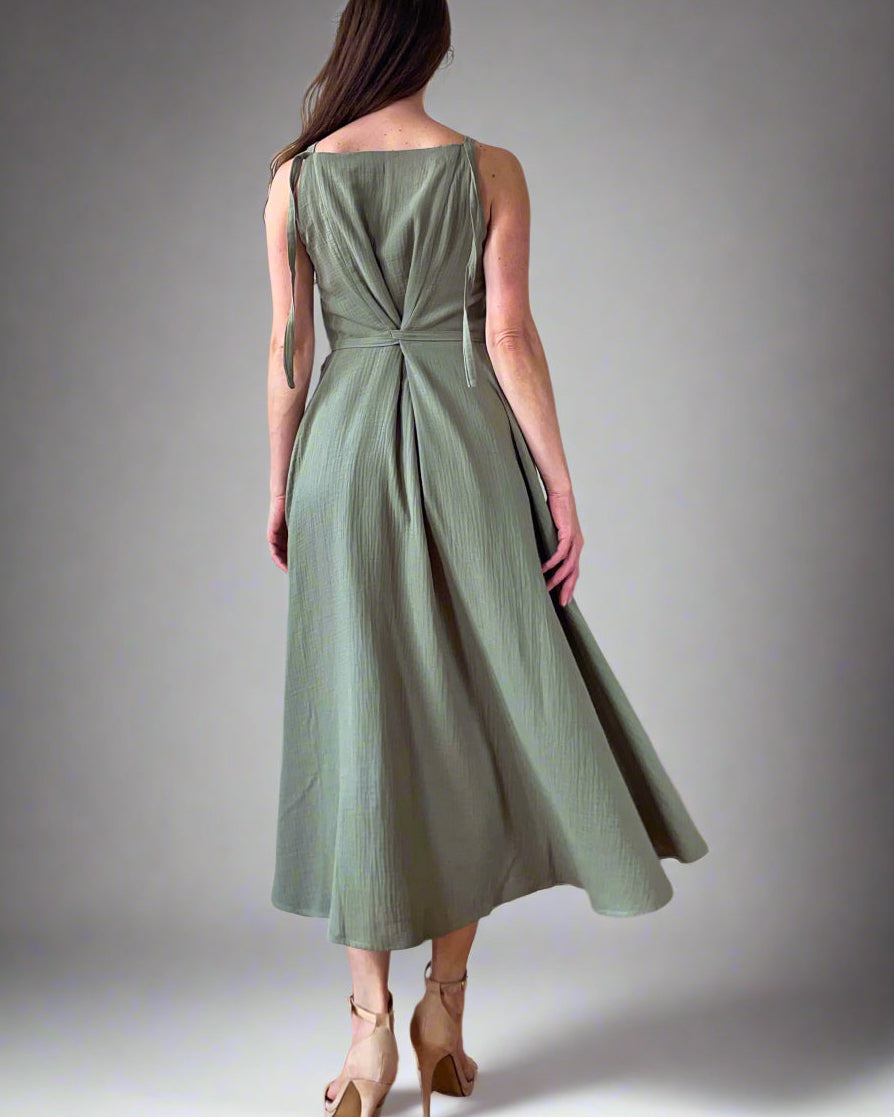 Sokoldalúan kihasználható forgatható fazon, aminek a vállpántjait és a derékkötőjét is többféle módon lehet megkötni. A derékvonalba illesztett megkötőkkel a ruha bőségét előre vagy hátra is lehet kötni. Forgatható fazon: egyik oldala csónak nyak, itt a vállpántokat masnira kötve, vagy csomózva is köthetjük, a másik oldala kicsi V kivágás, amit vállpántok különböző megkötésével lehet formázni, keresztben áthúzva, azonos oldalon nyakba kötve, középen kis masniba bekötve behúzni a kivágást.