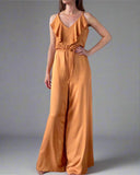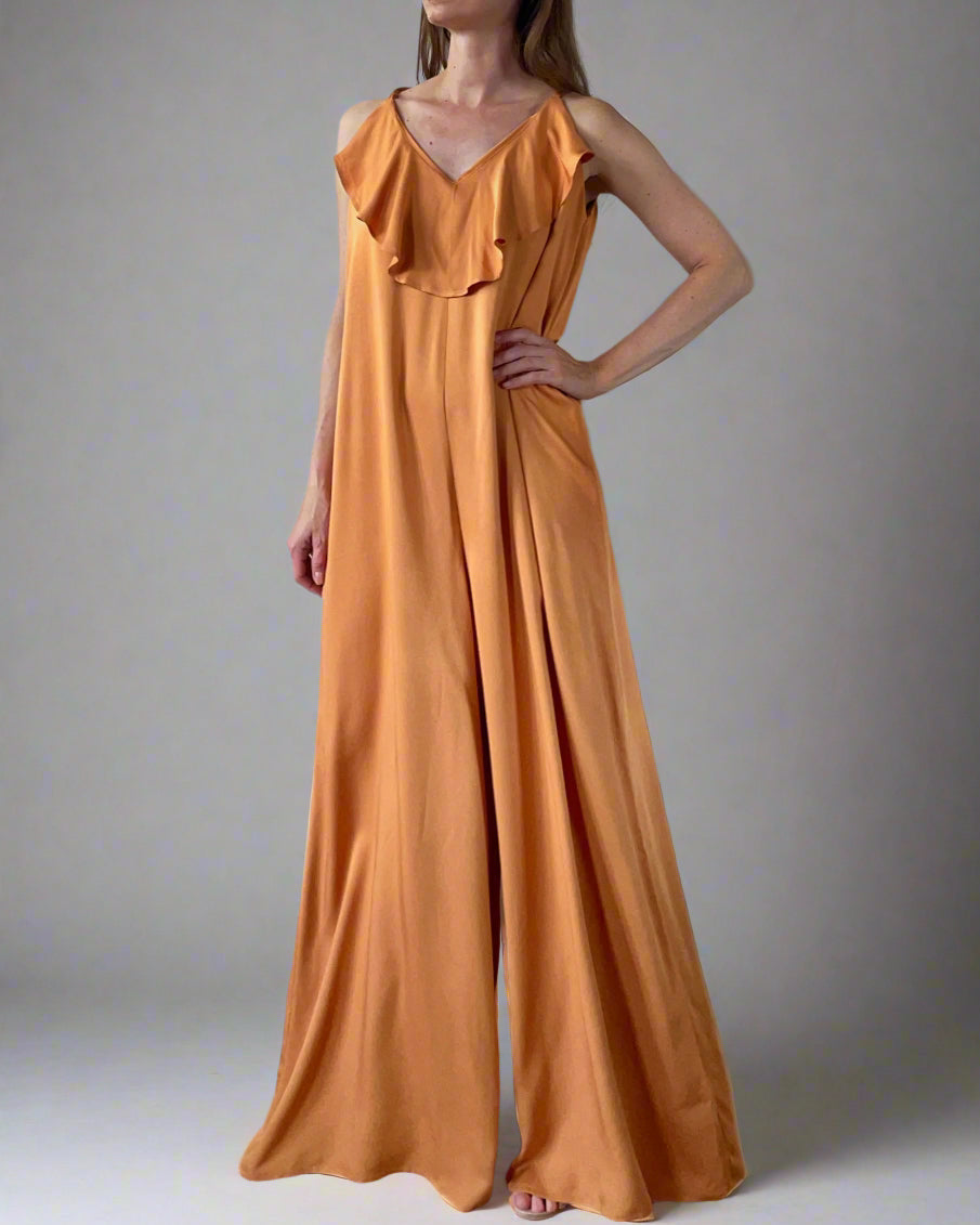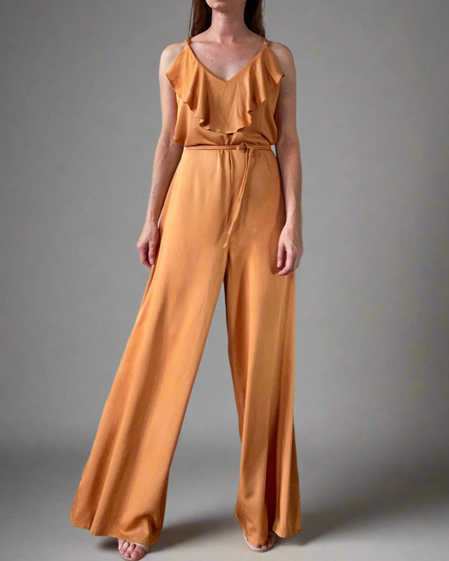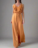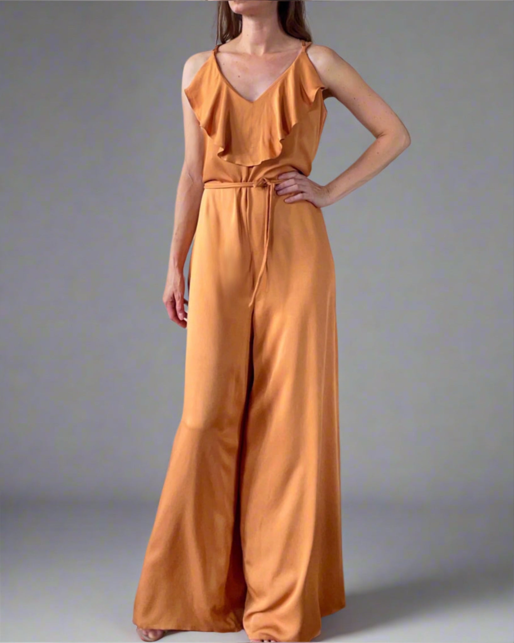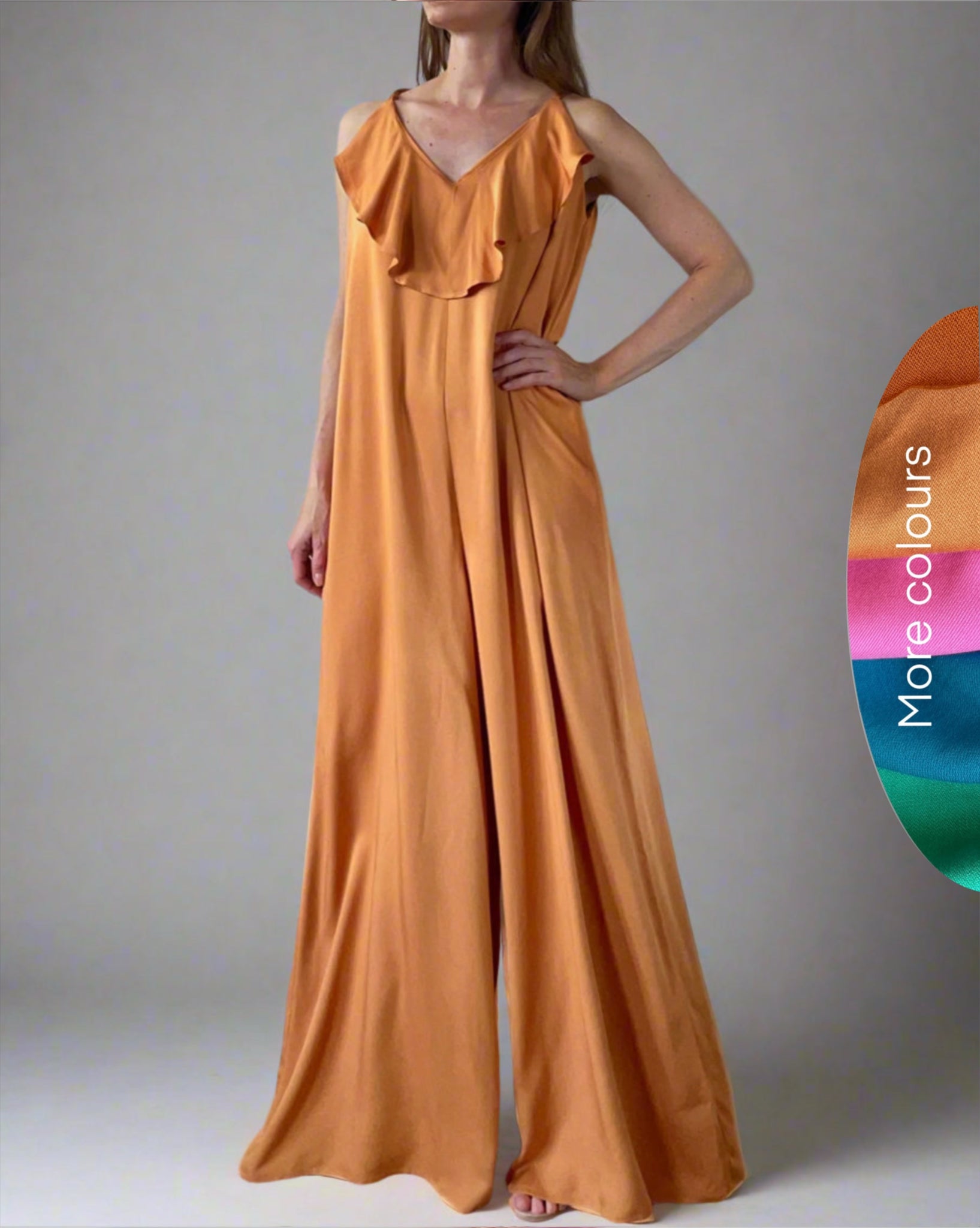 Bő szárú maxi overall fazon, állítható vállpántokkal. A saját anyagából készült derékkötő levehető, így hordható a fazon lazán is.