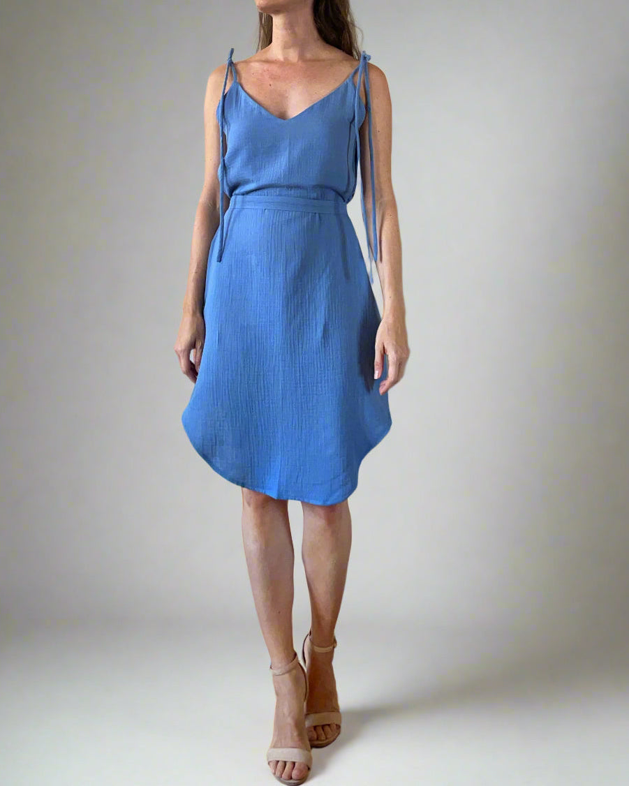 Íves aljú, lefele enyhén bővülő mini ruha, megköthető vállpántokkal. Saját anyagából készült derékpántja levehető.
