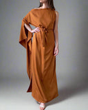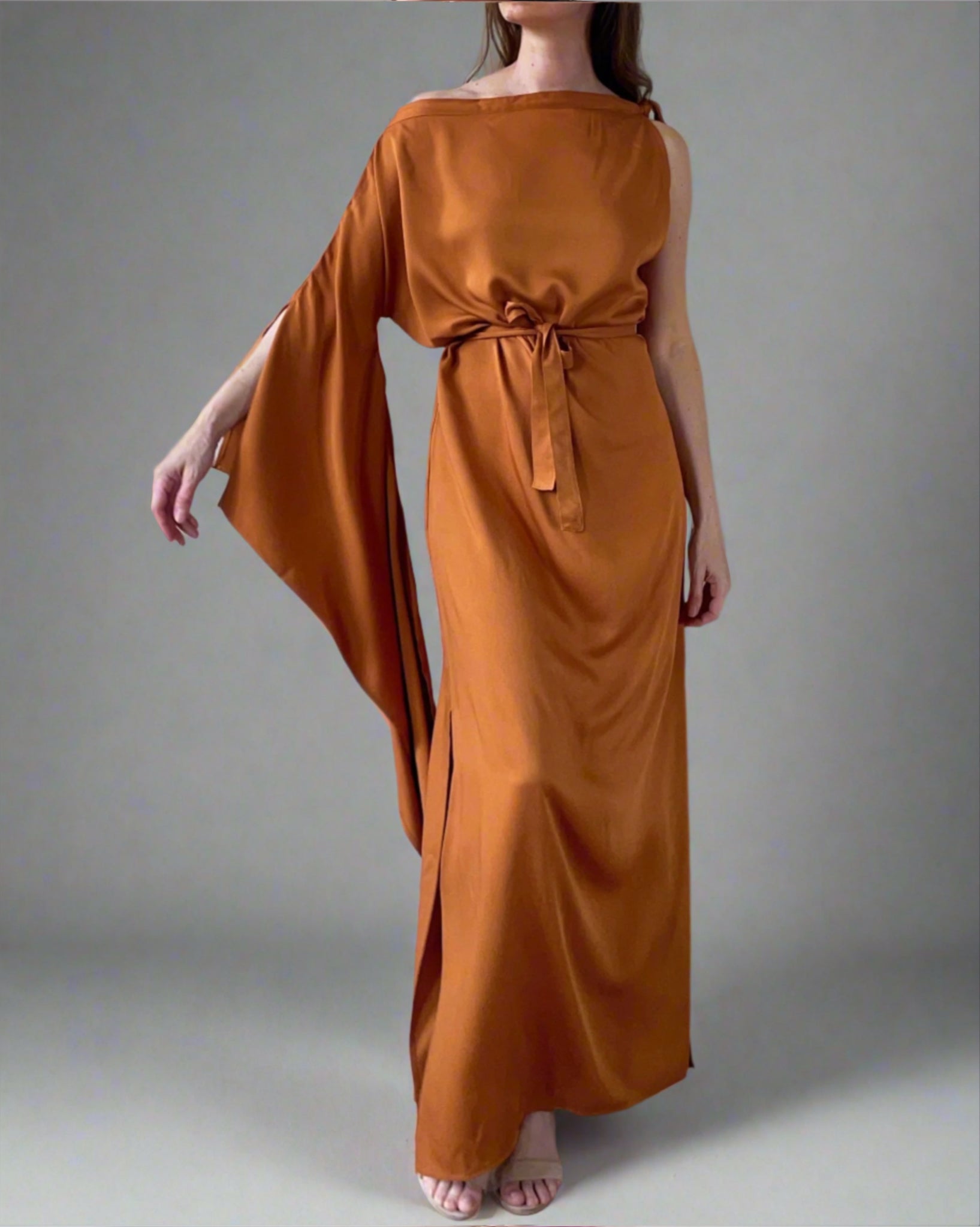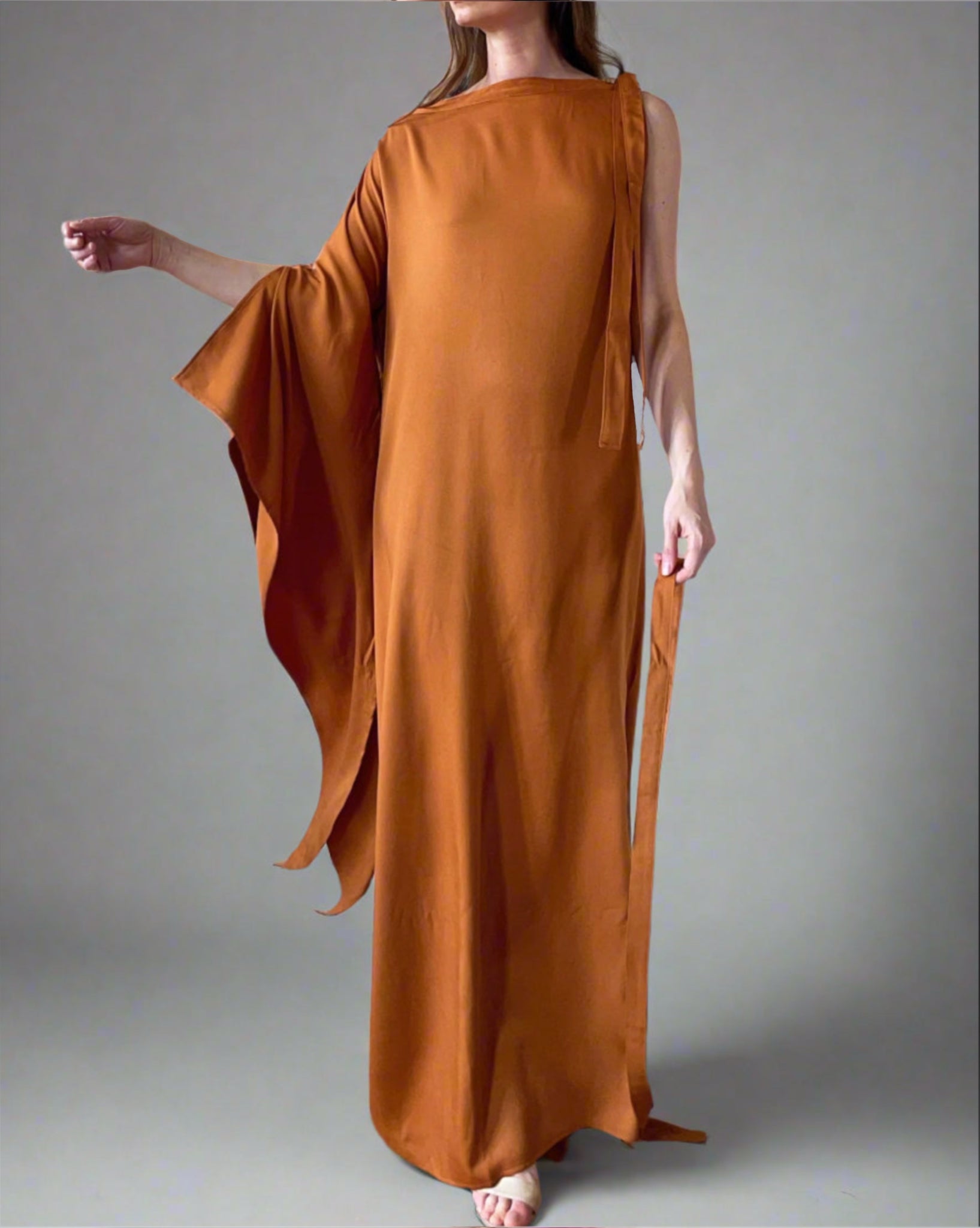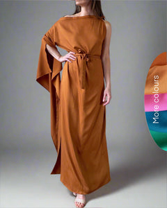 Egyenes szabású megkötős vállú ruha, féloldalas tündér ujjal. Kétoldalt sliccelt. Saját anyagából készült derékkötője levehető.