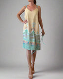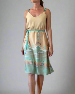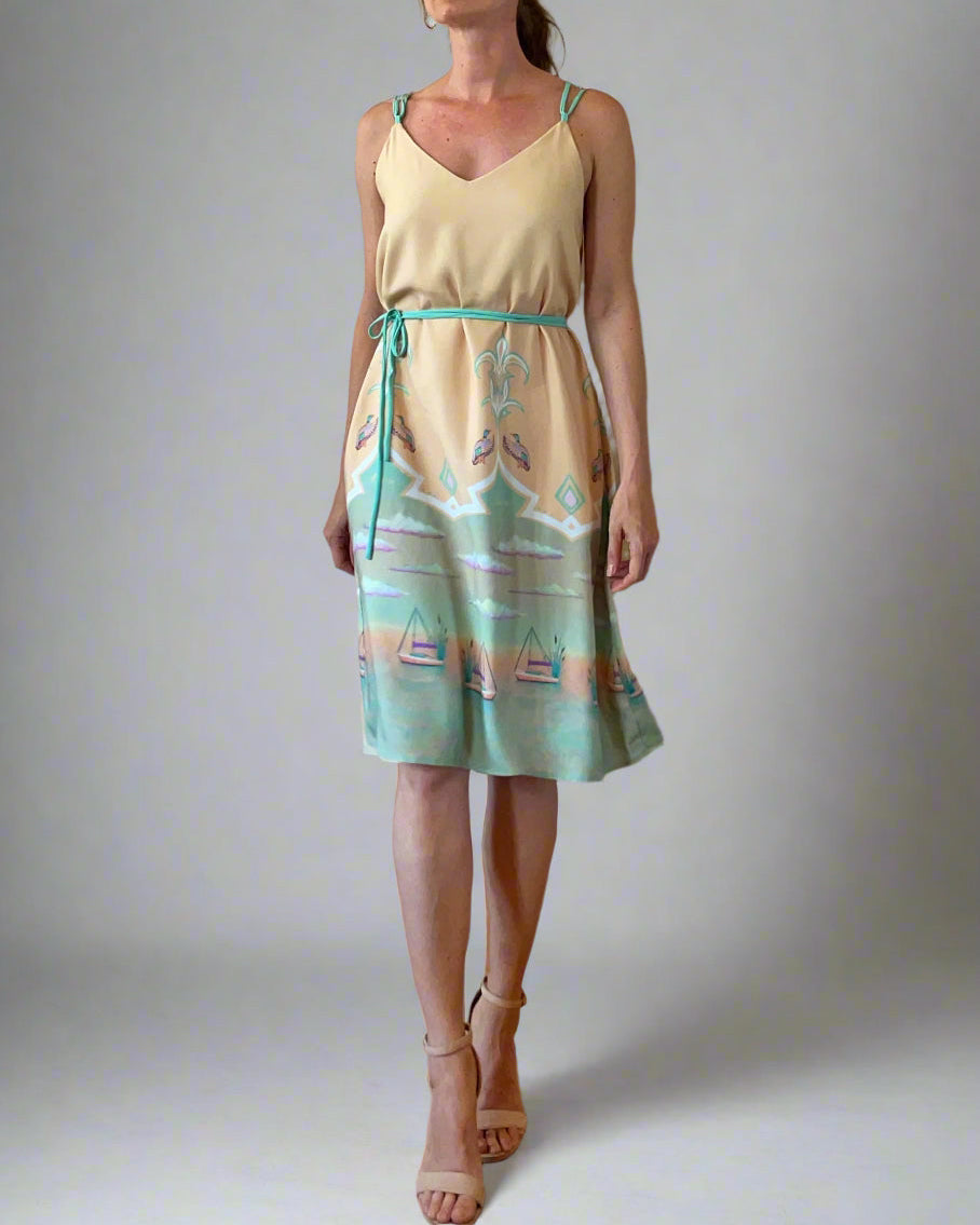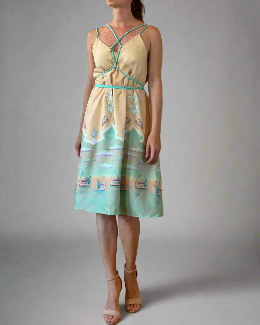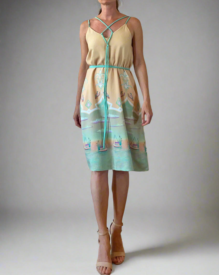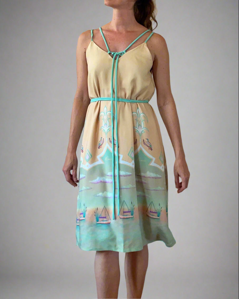 Balaton ihlette saját rajzokkal tervezett egyedi textilből készült könnyű nyári mini ruha. Vékony viszkózból.