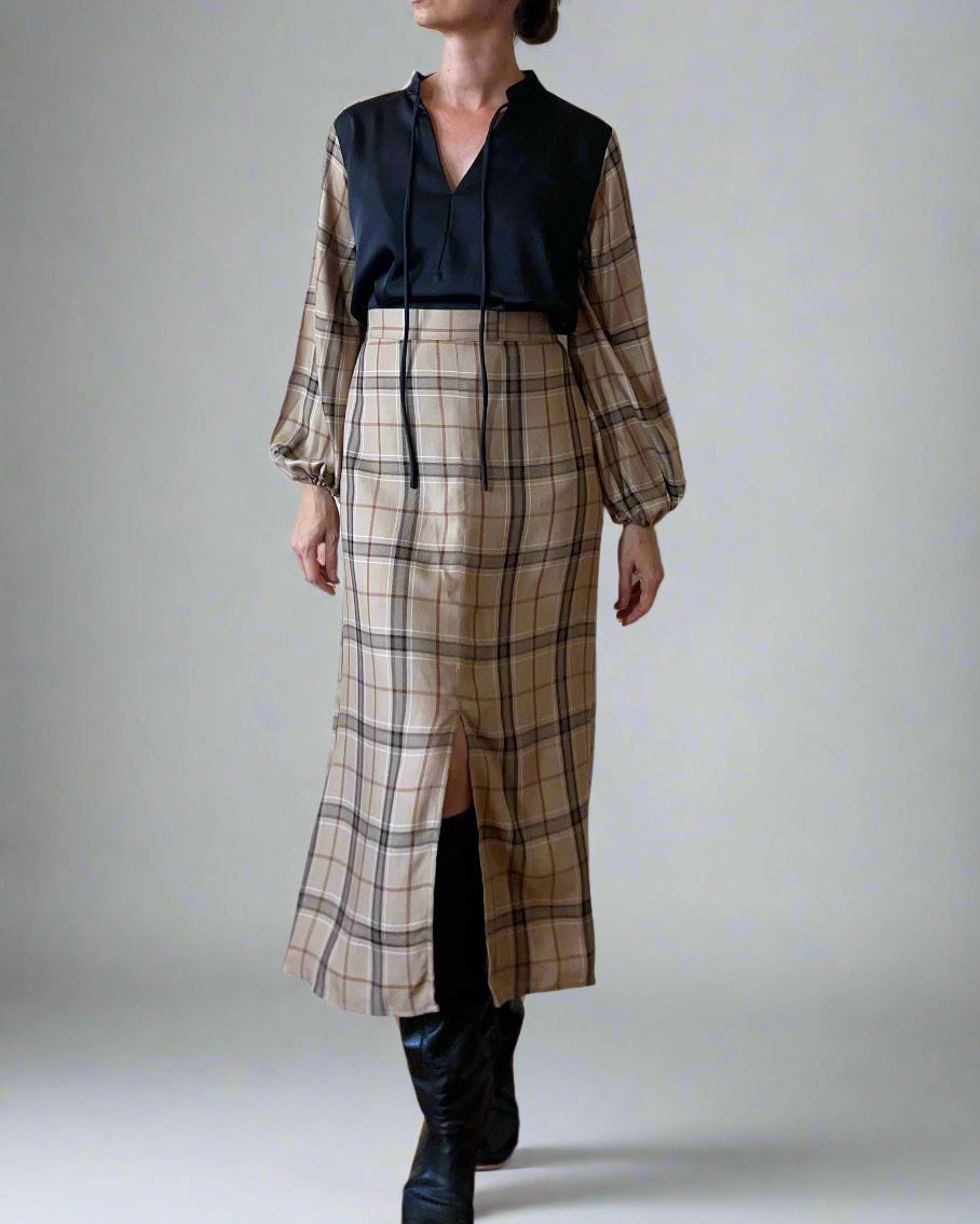 Egyenes bő szabású Ava felső, alló gallérral, a nyakkivágáson vékony megkötővel, amit kiengedve vagy masnira kötve is hordhatunk. Test rész fényes szatén, ujj rész matt viszkóz.