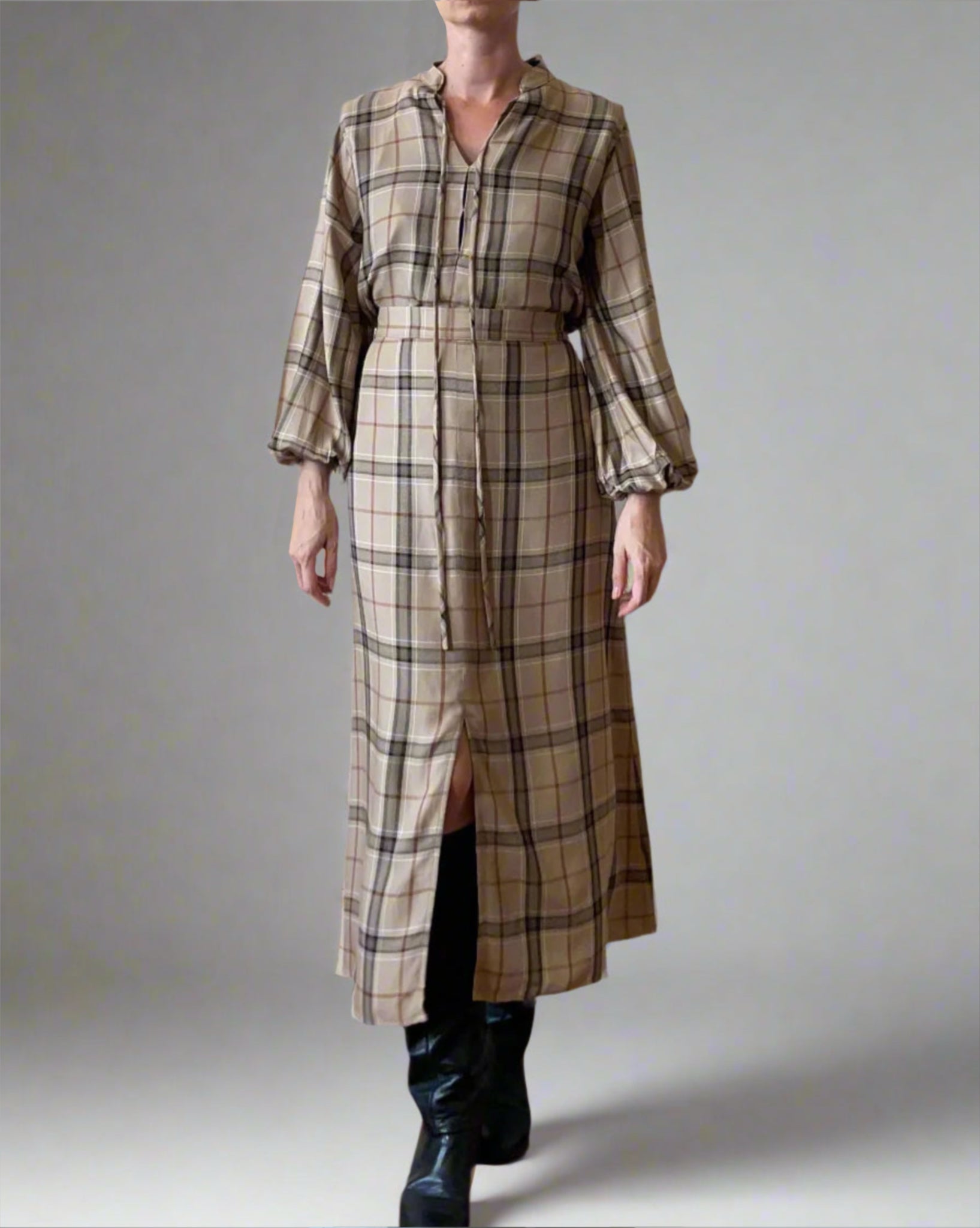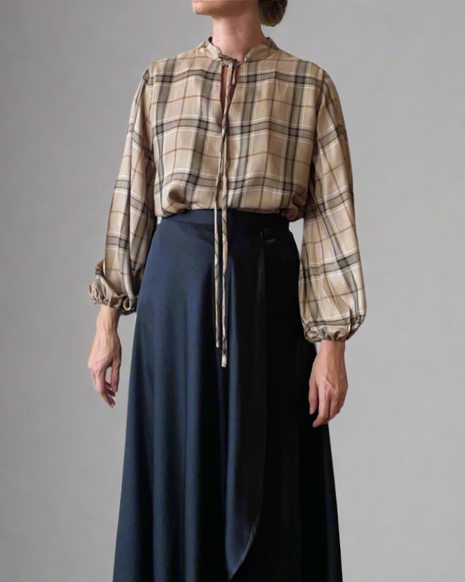 Egyenes bő szabású Ava felső, alló gallérral, a nyakkivágáson vékony megkötővel, amit kiengedve vagy masnira kötve is hordhatunk.