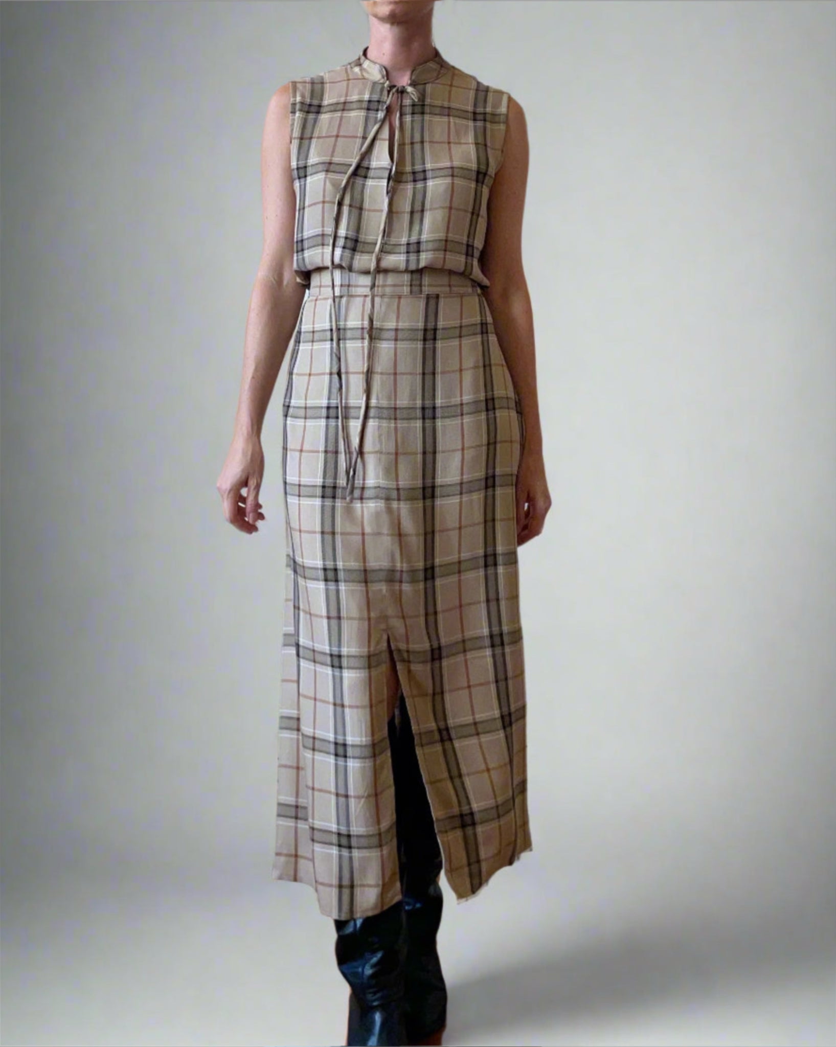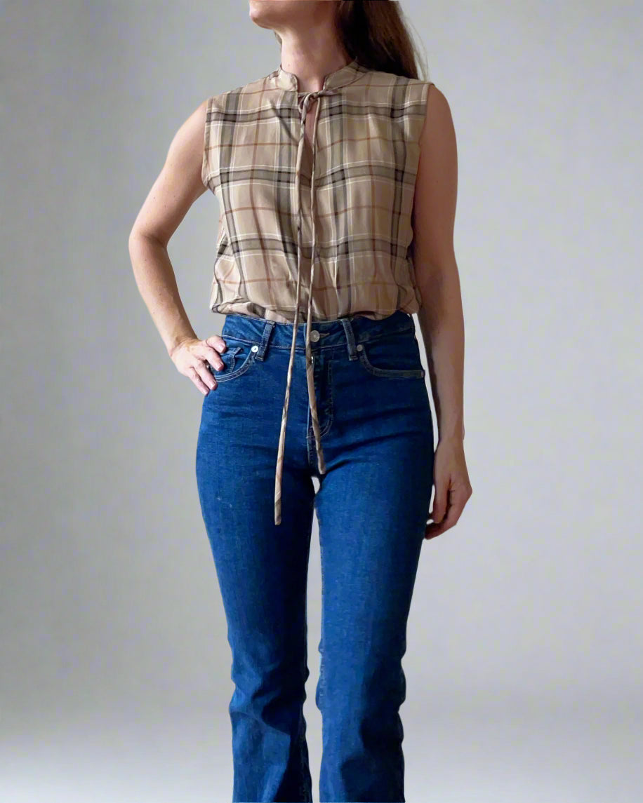 Állógalléros nyakban megkötős egyenes szabàsú viszkóz top.