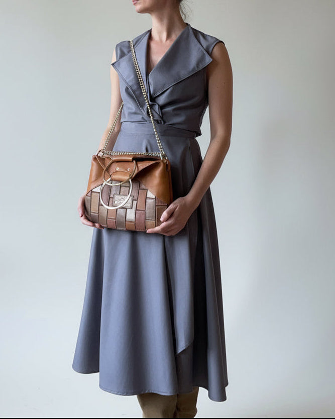 Átlapolós íves szabású wrapszoknya. Szatén és kockàs viszkóz kombinációja.