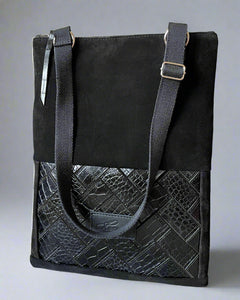 Ez a darab elől fekete velúr, fekete lakkbőr croco print mozaikkal díszítve, hátoldala fekete színbőr. A Zipper fazonok hátiként, vagy a pántokat átcsatolva oldaltáskaként is használható.