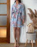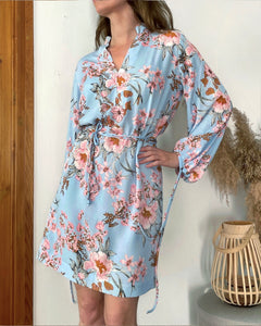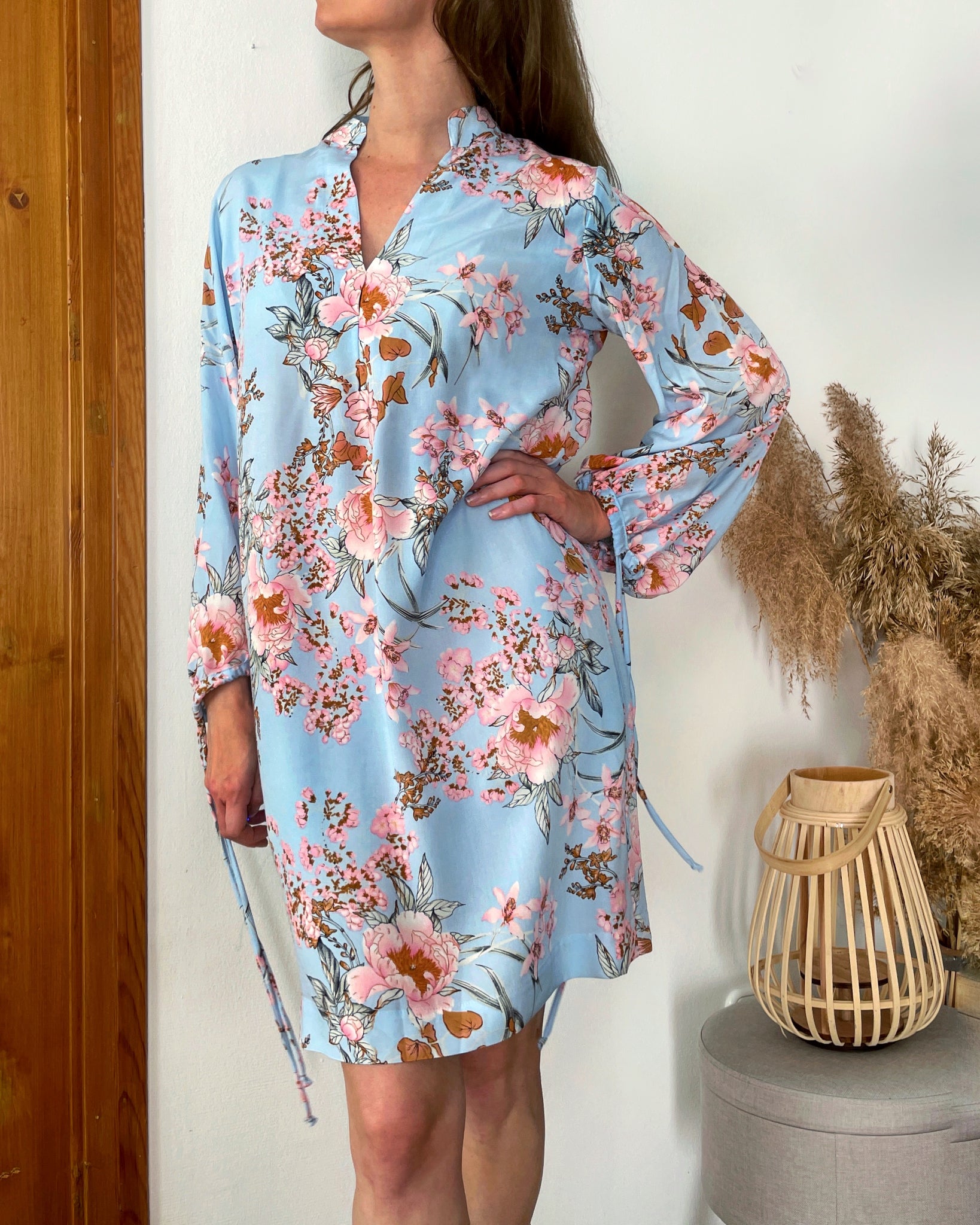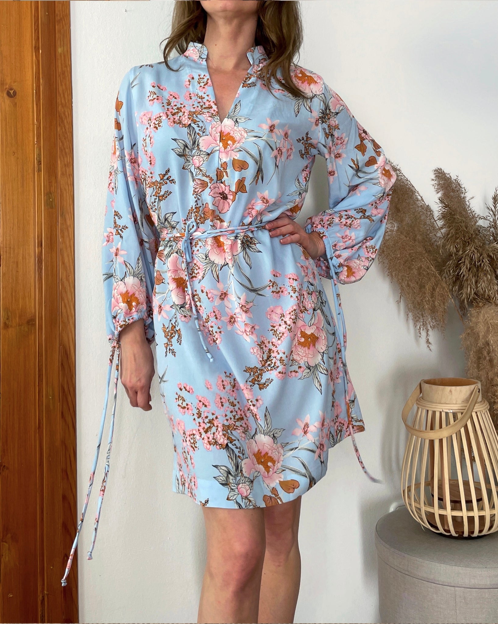 Soft and light fabric, straight cut dress, with oriental looking standing collar, V neckline and puffy sleeves. Removable waistband.