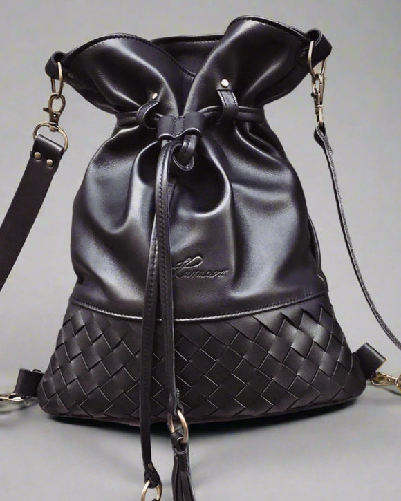 Leather backpack/totebag style with woven details. Convertible straps for a backpack or a totebag style, two small pockets inside.