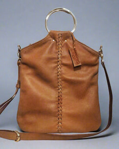 Kézzel készített bőr O-ring táska. A táska eleje fonással díszített.