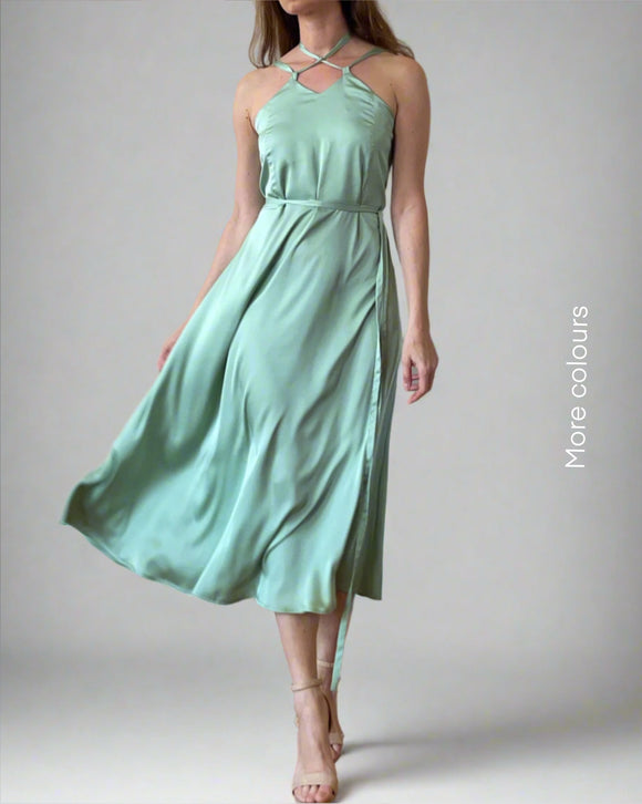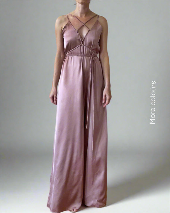 Masnis nyakú overall, hatoldalon mélyebb V-kivágással. Gumival húzott buggyos ujjakkal, amit háromnegyedes hosszra is fel lehet húzni. Lefele bővülő szárú fazon, levehető saját anyagából készült derékkötővel