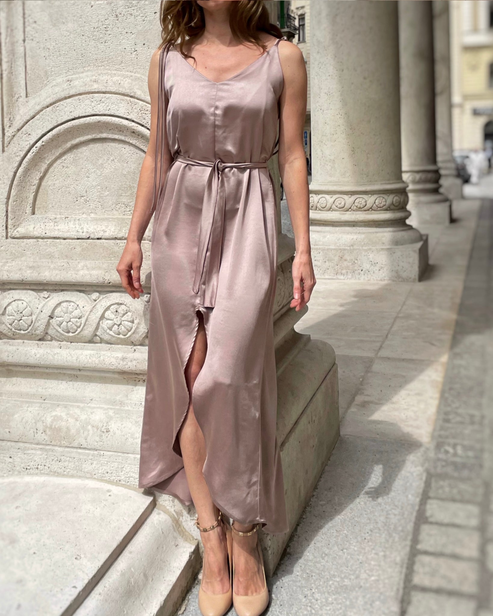 Íves aljú, lefele bővülö ruha, állítható vállpántokkal. Többféleképpen lehetséges a pántokat megkötni, így a sliccet előre, oldalra vagy hátulra is pozicionálhatod. Ez a kis részlet teszi igazán sokoldalúvá ezt a fazont. A saját anyagából készült derékpántja levehető. Elegáns és lazán elegáns eseményeken is tökéletes viselet. (Kismamáknak is ajánljuk.)