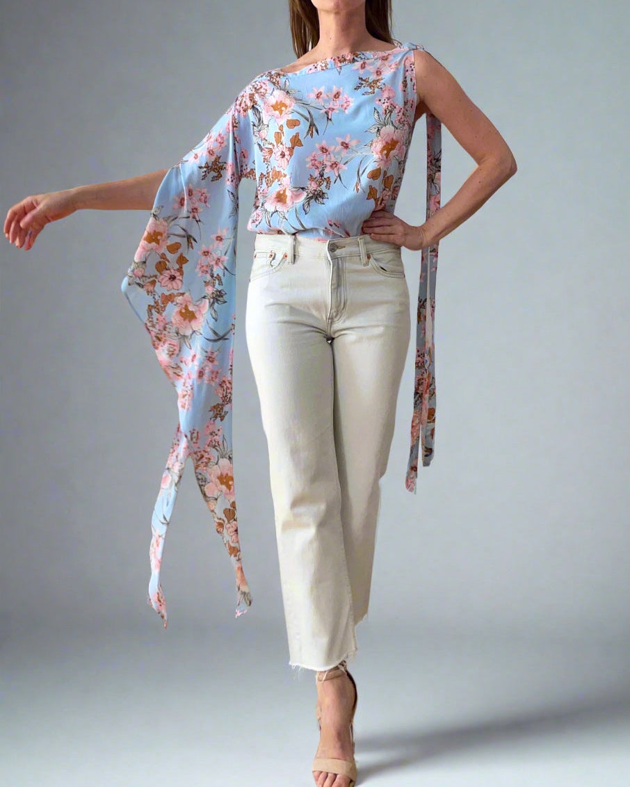 Shtraight cut top with fairy long sleeve on one side and sleeveless on the other side with adjustable shoulderstraps. The long straps you can also wrap around your arm if you want to make your look more exotic.
