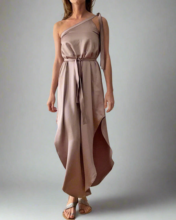 Íves aljú lefele bővülő fazonú ruha, aszimmetrikus vállal, megköthető vállpánttal. Kétoldalt íves sliccel. Saját anyagából készült derékpántja levehető.