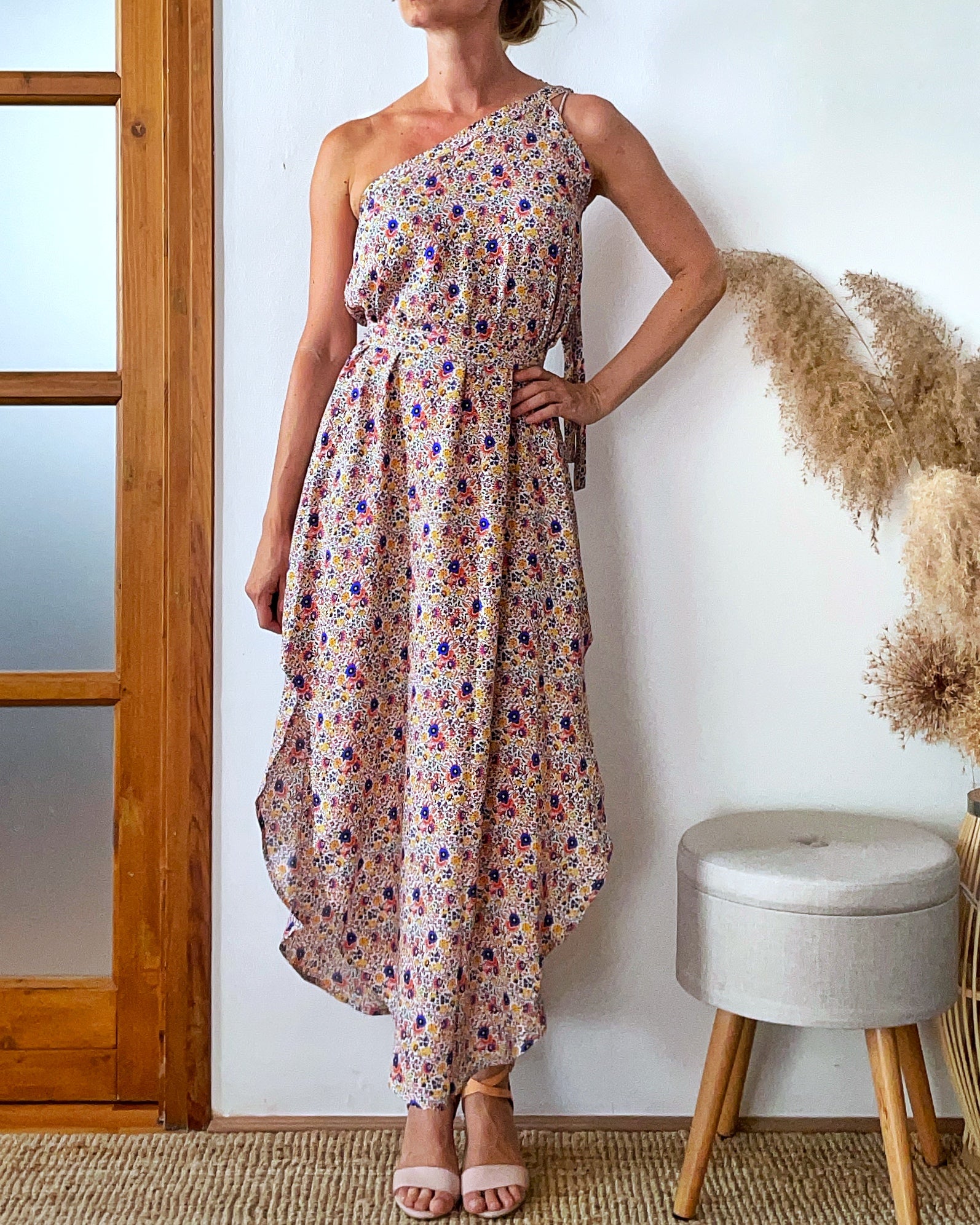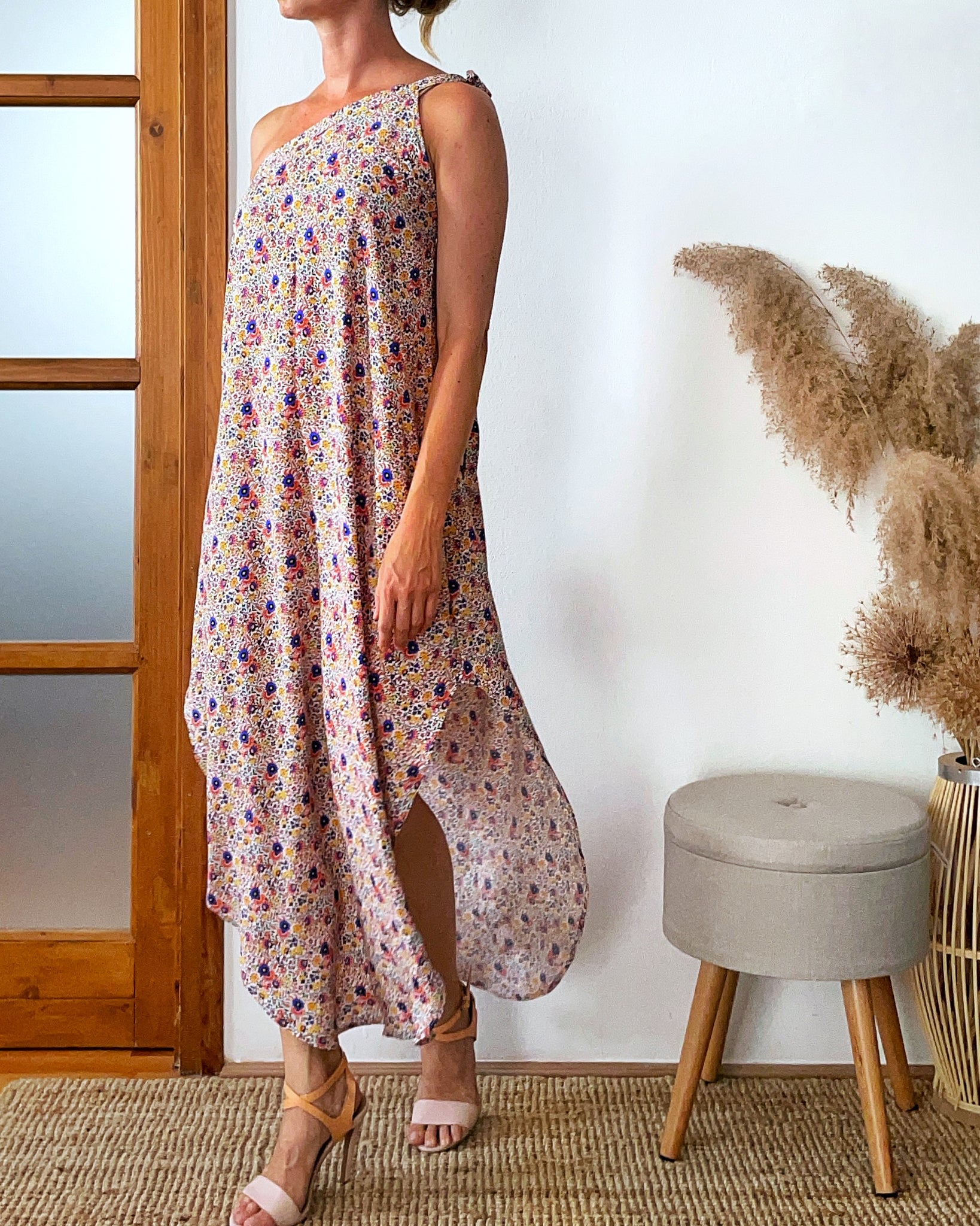 Floaty dress with asymmetric shoulder and adjustable shoulderstrap, slit on the two sides. It comes with a waistband of its own fabric. You can wear the dress with or without the waitsband.