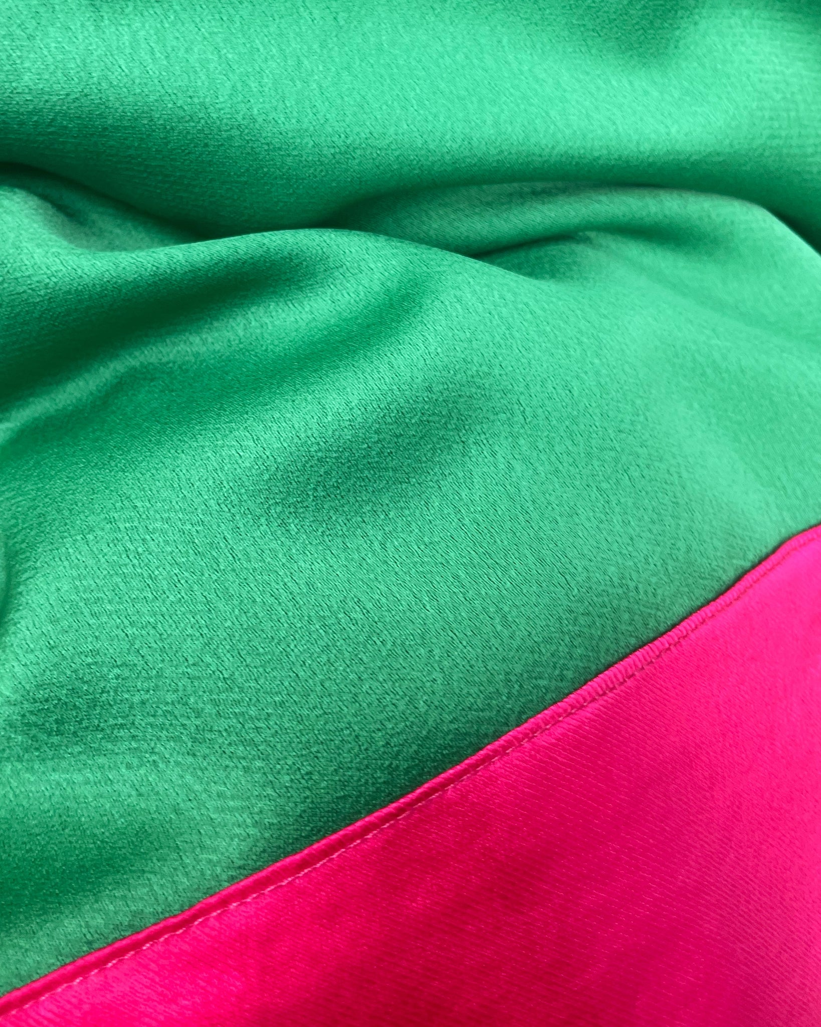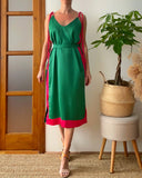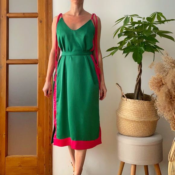 Hottest pink combined with grass green, coolest match! Straight cut dress with different colour edges and with adjustable shoulderstraps. Midi lenght.