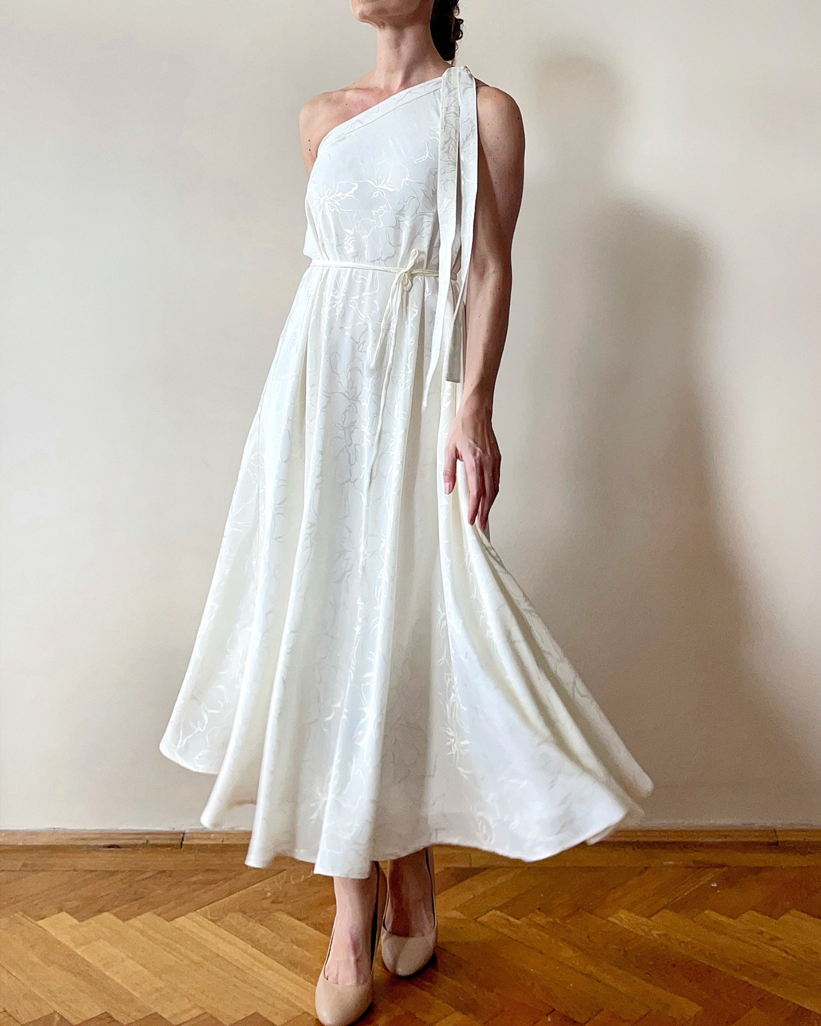 Aszimmetrikus vállú, bő A-vonalú, midi hossz pörgős ruha. Anyaga jaquard virágmintás viszkóz, alul viszkóz béléssel. Vállpántja megköthető. A  saját anyagából készült derékpántja levehető. Elegáns és lazán elegáns eseményeken is tökéletes viselet.