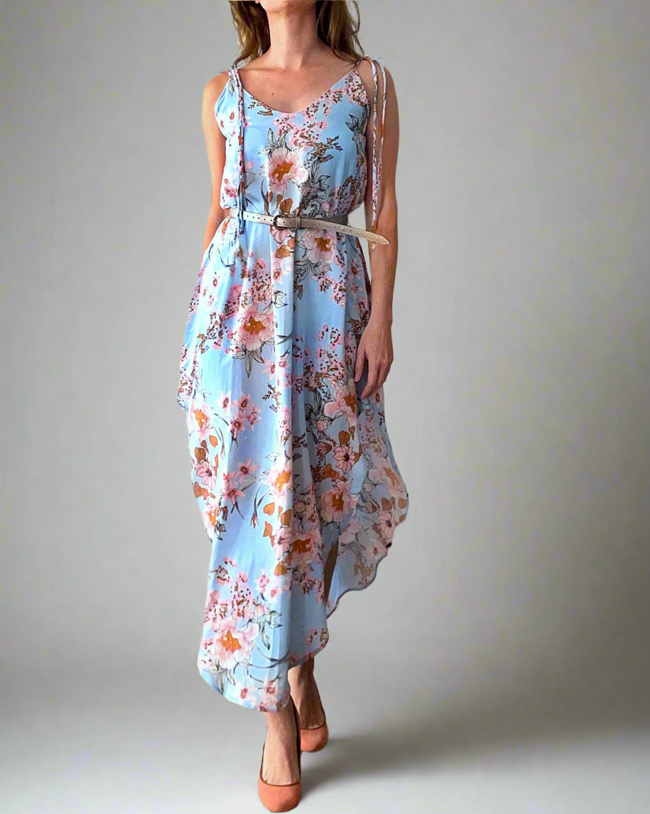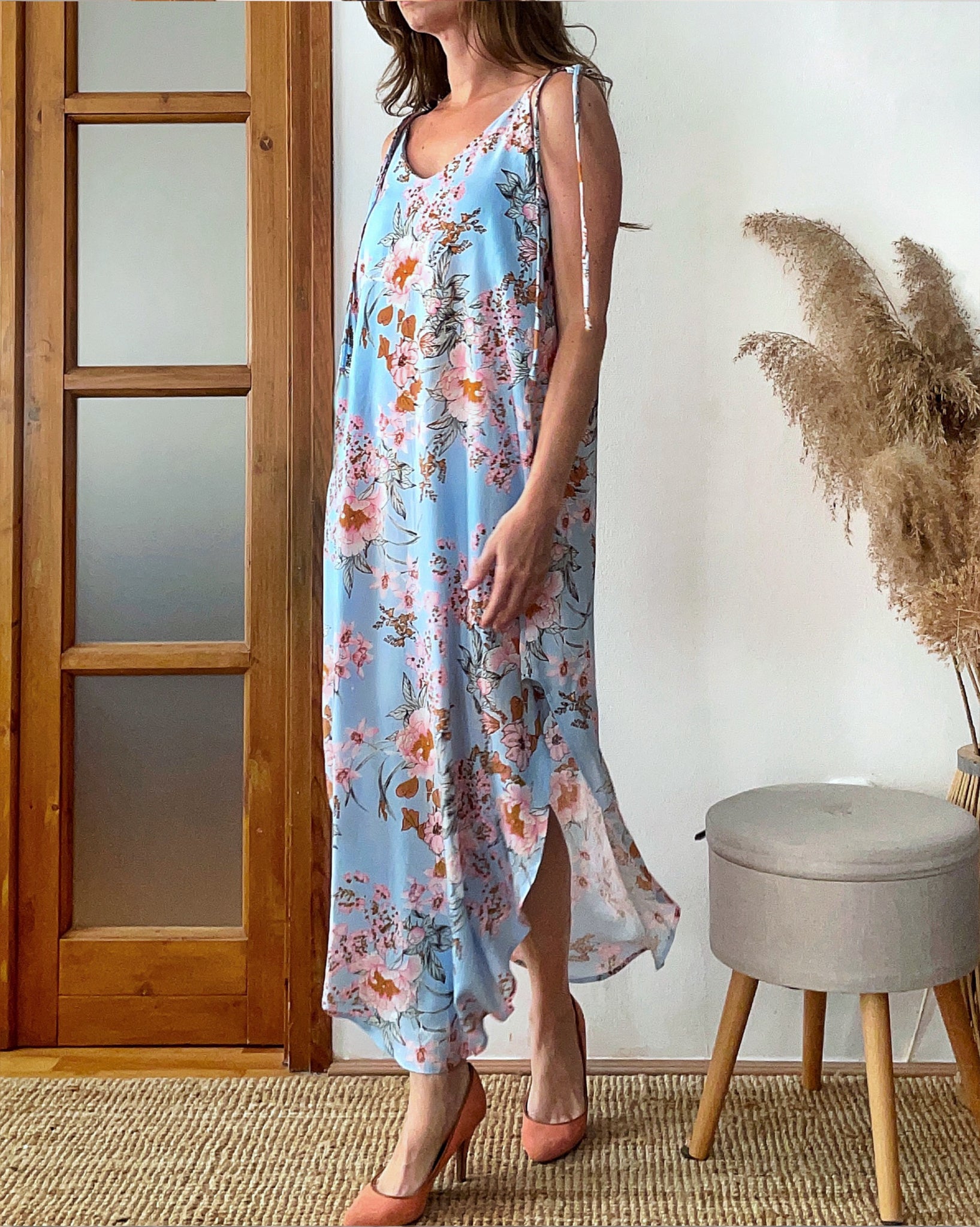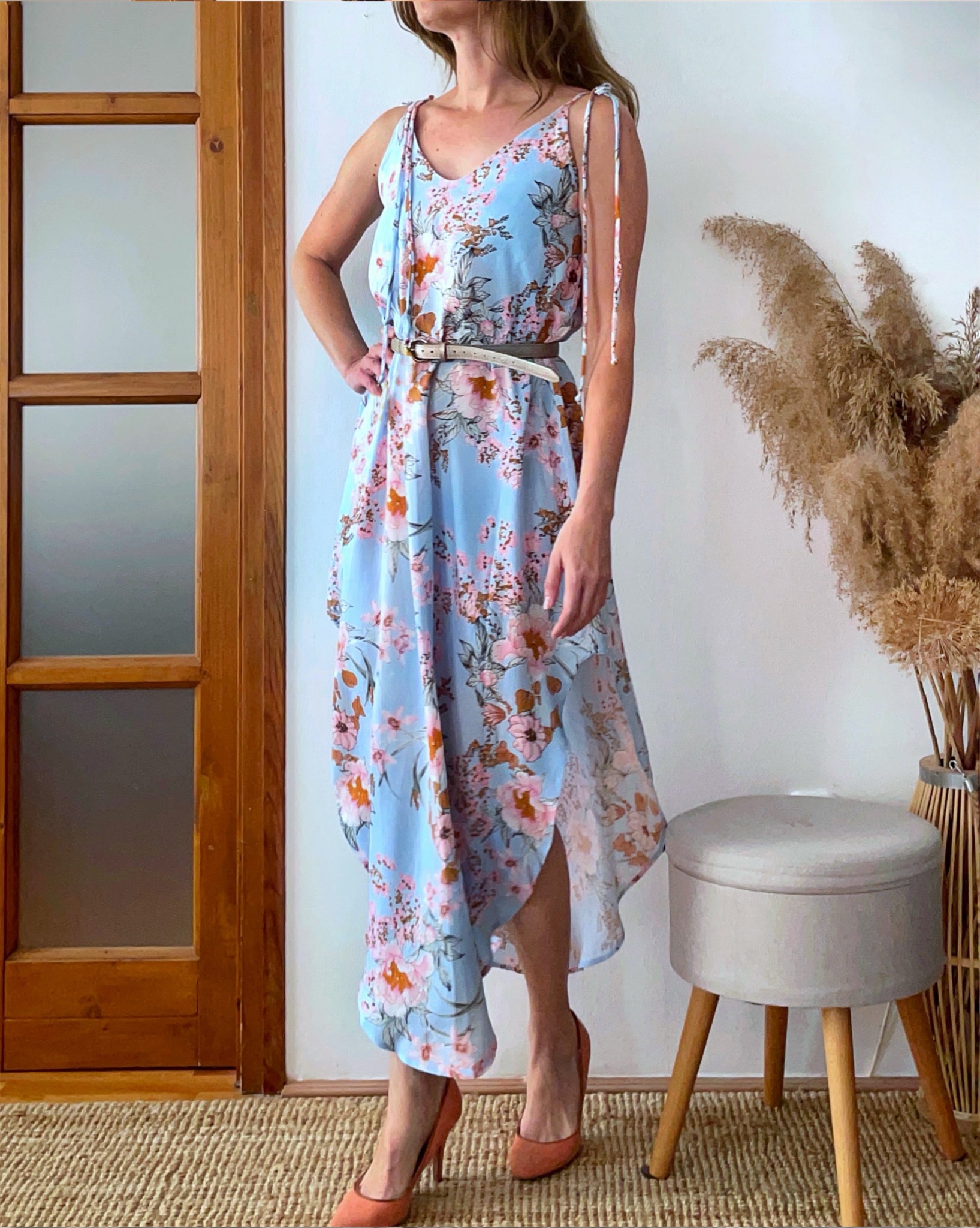 Floaty light fabric maxi dress with adjustable shoulder straps, it comes with a waistband of its own fabric. You can wear the dress with or without the waistband.