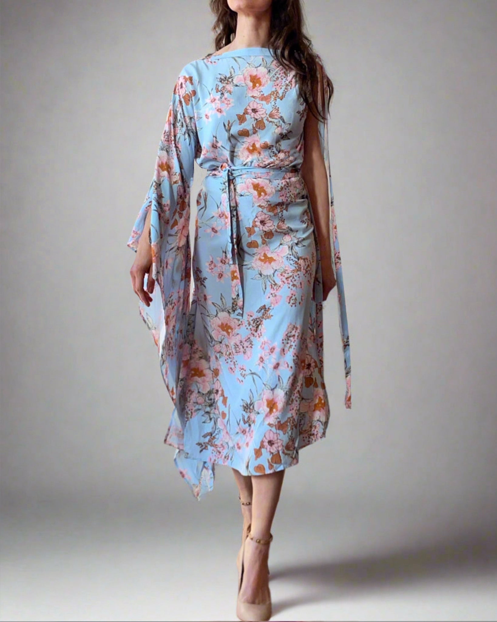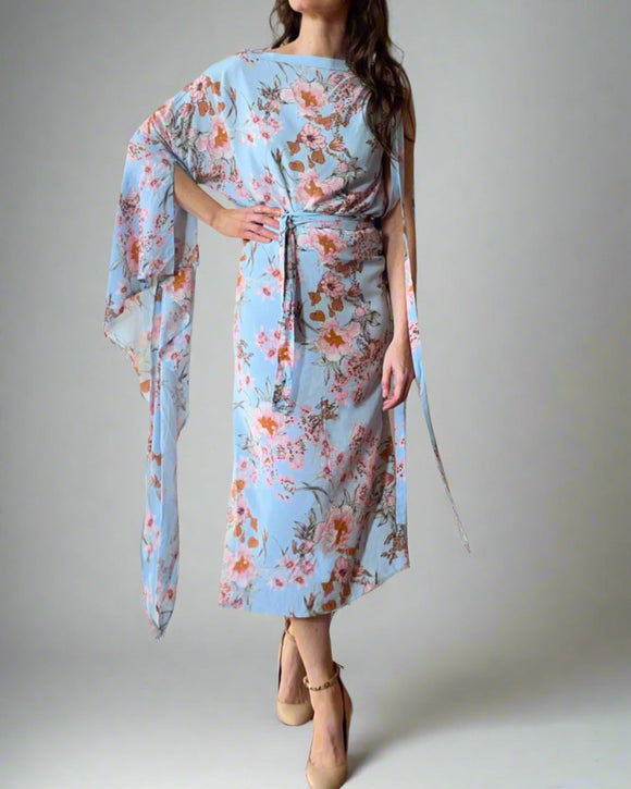 Egyenes szabású megkötős vállú ruha, féloldalas tündér ujjal. Kétoldalt egyes hasítékkal. Saját anyagából készült derékkötője levehető.