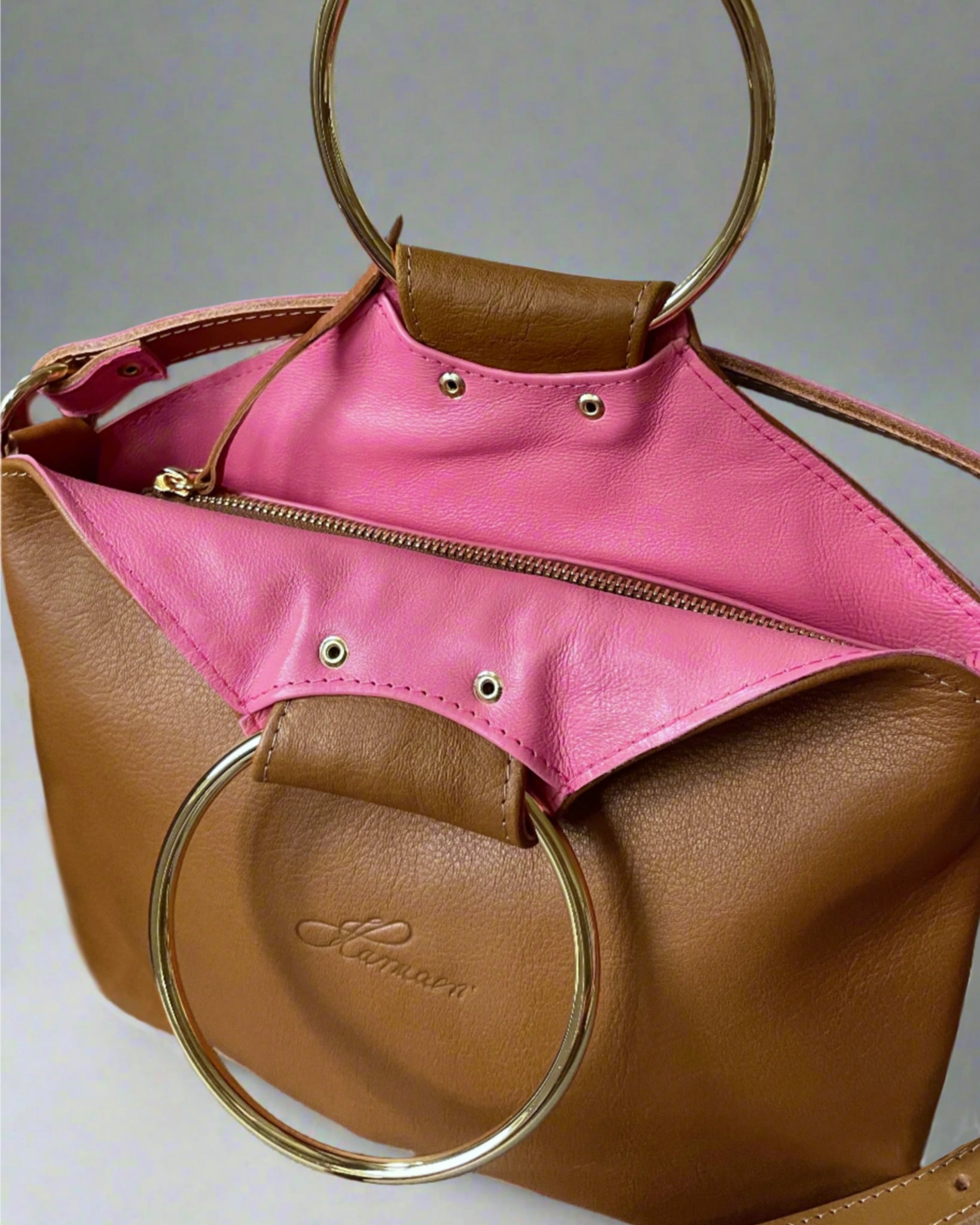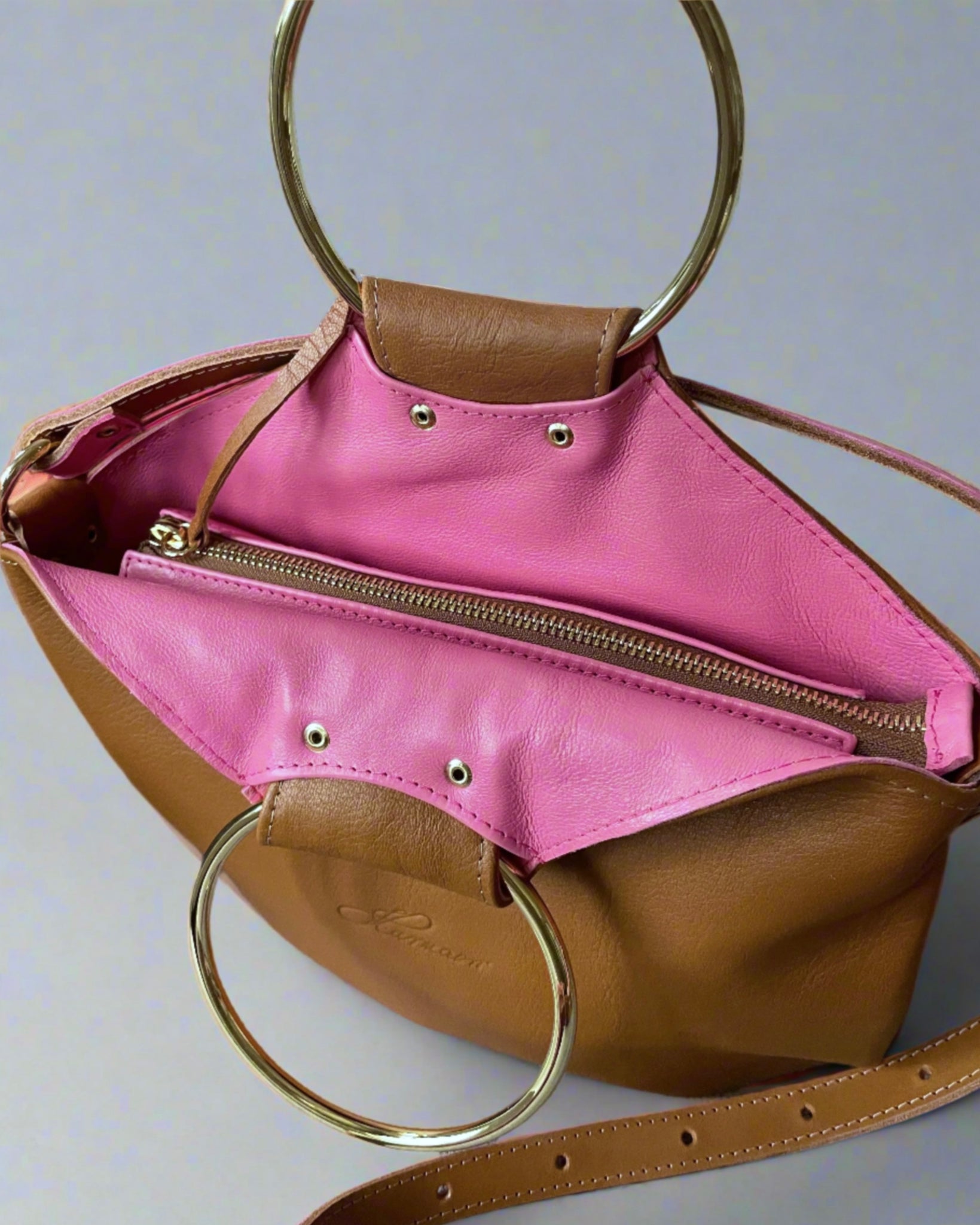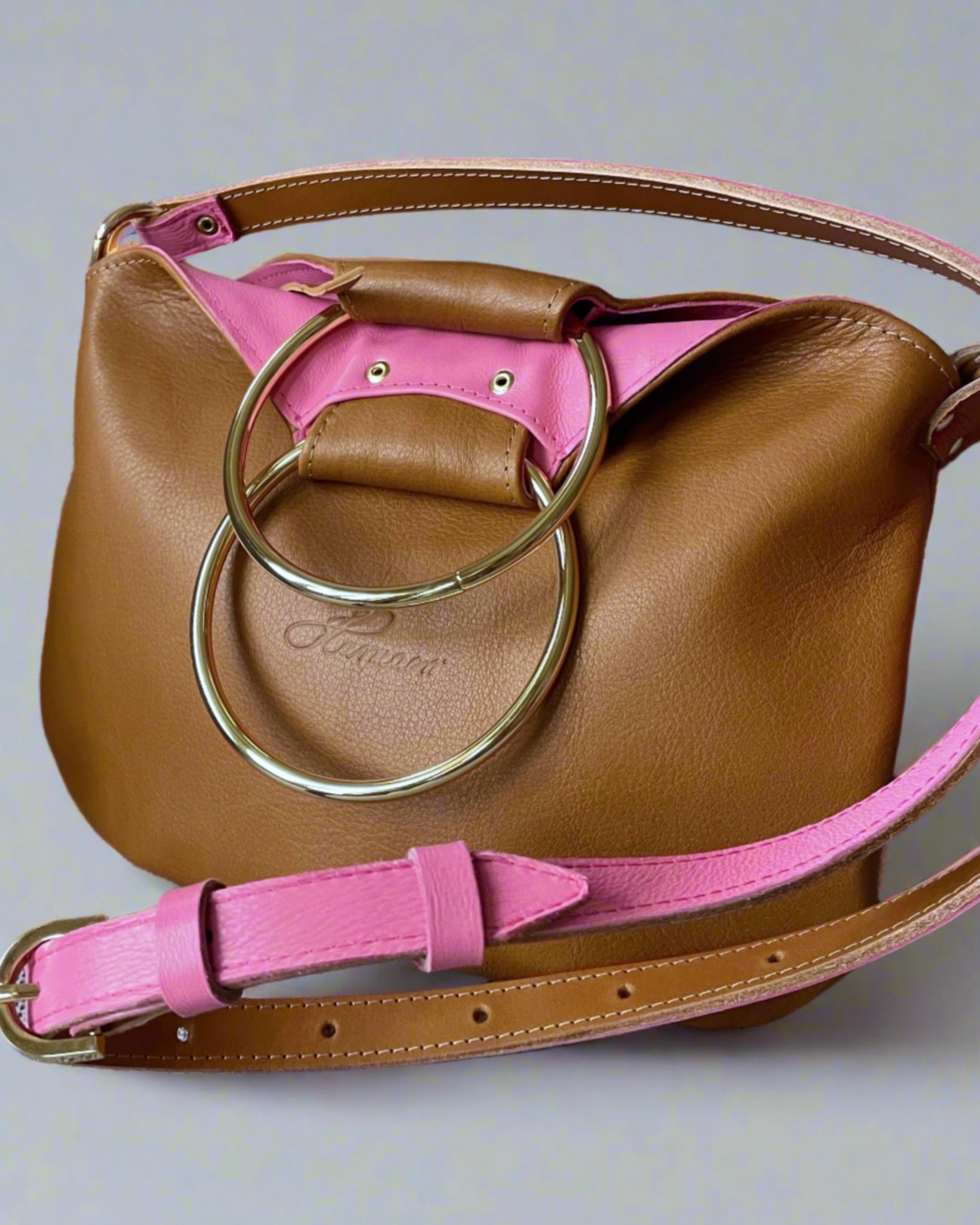 Barna és pink bőr kombináciòs O-ring válltáska. Húzózáras záródás nélkül is kérheted.