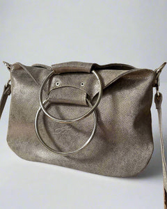 Kézzel készítettet bőr O-ring táska. Textúrált ezüstös szürkés metálos csillogású bőr.