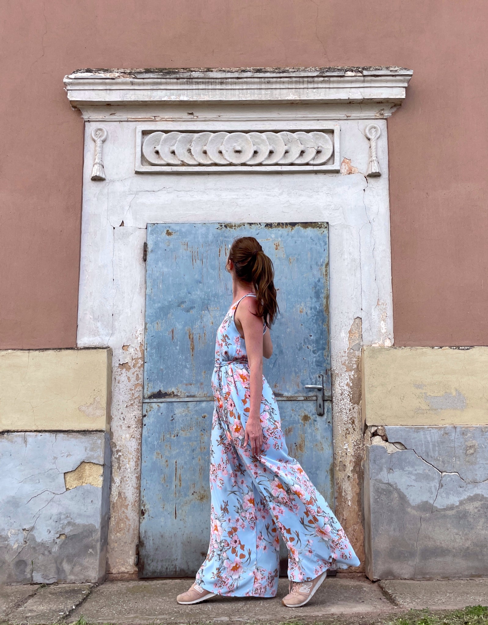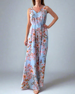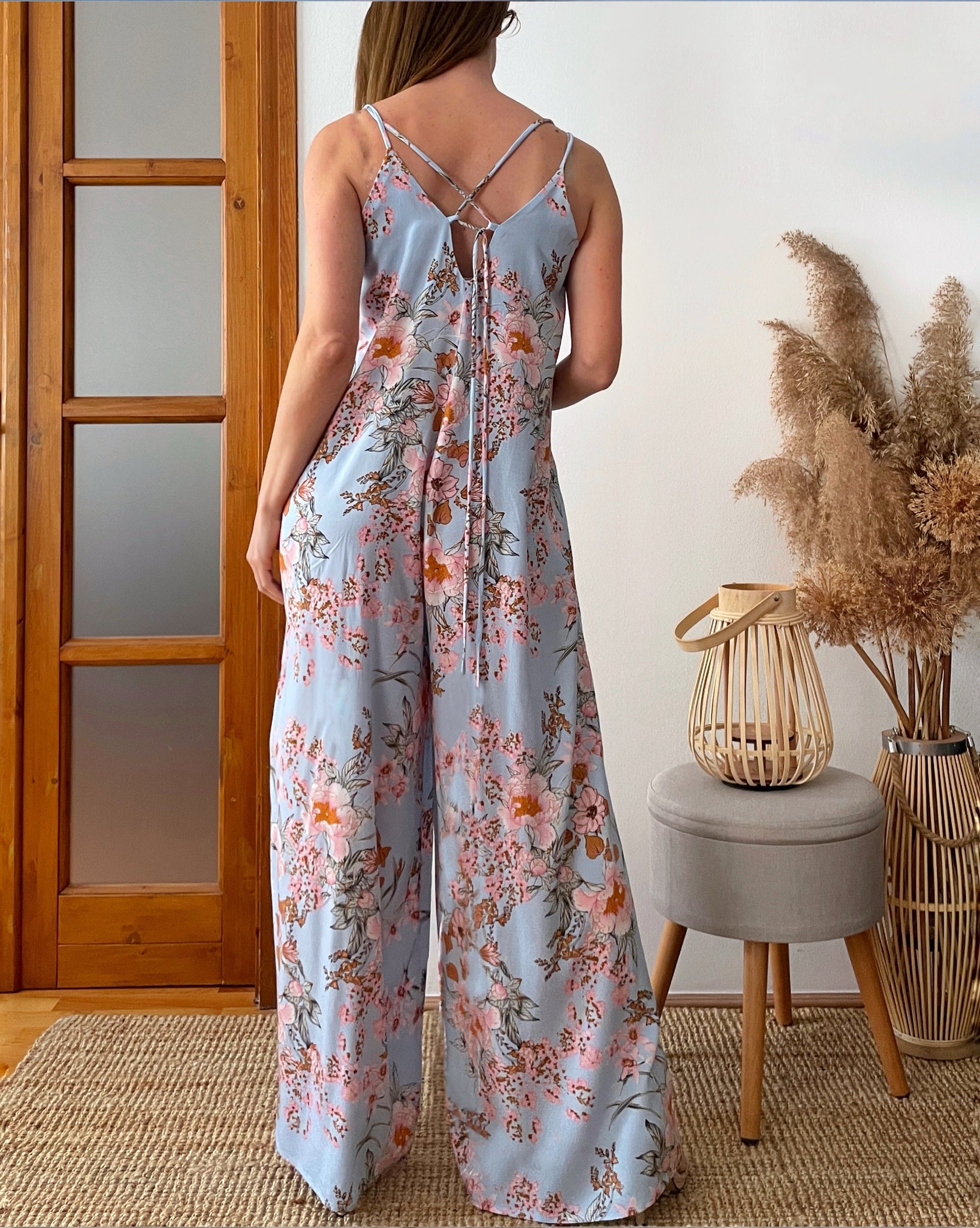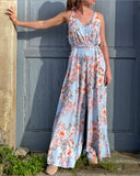 Bő szárú maxi overall fazon, állítható vállpántokkal. A saját anyagából készült derékkötő levehető, így hordható a fazon lazán is.