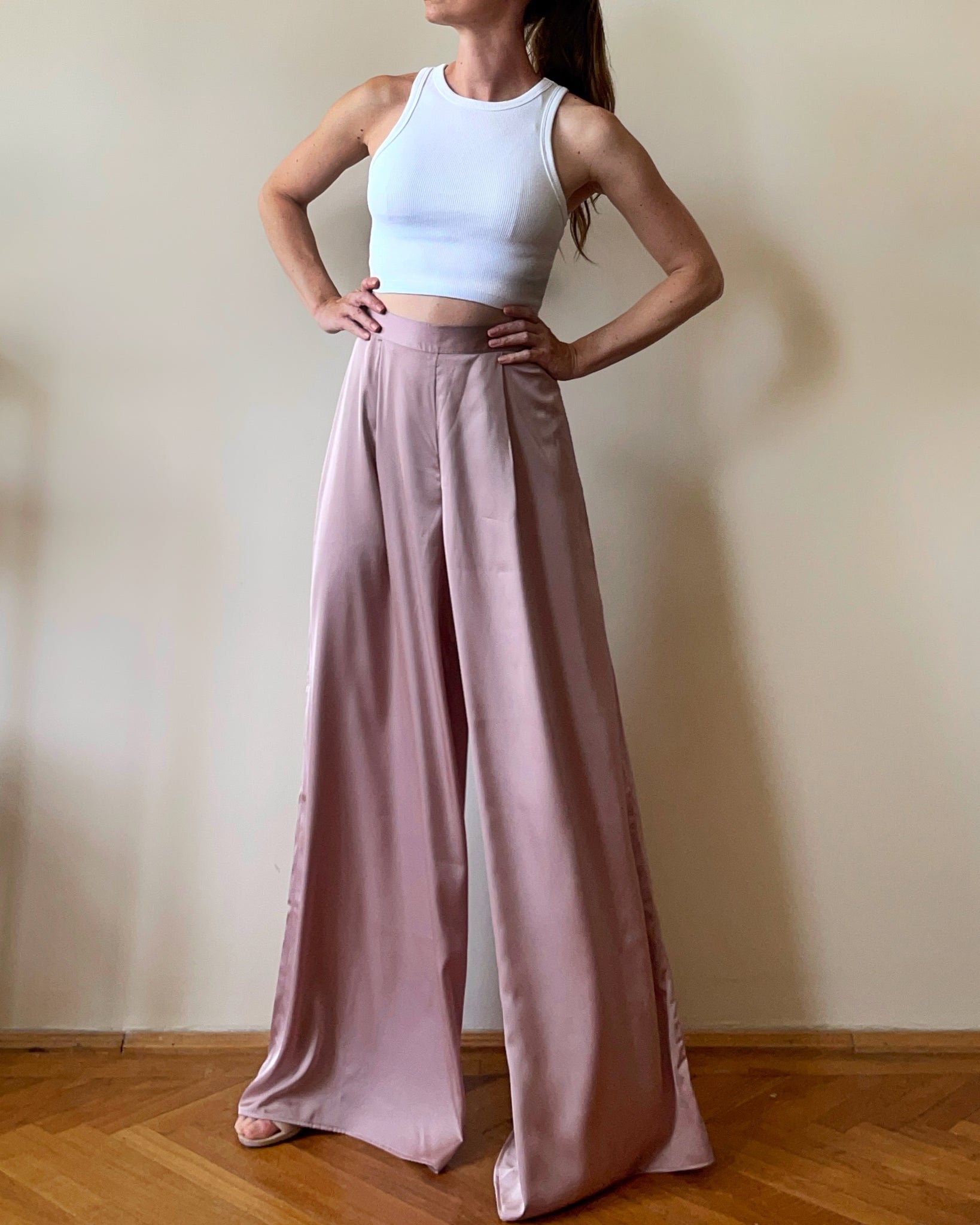 Álllítható derékszélességű bő szárú palazzo pants. A hátsó rész összehúzásával a saját derékméretedre állíthatod a nadrágot, előlről pedig letisztult képet mutat a fazon.