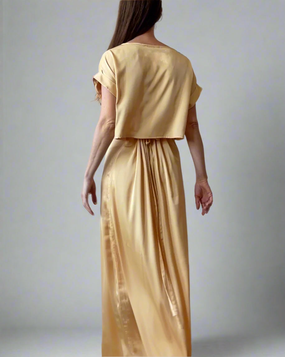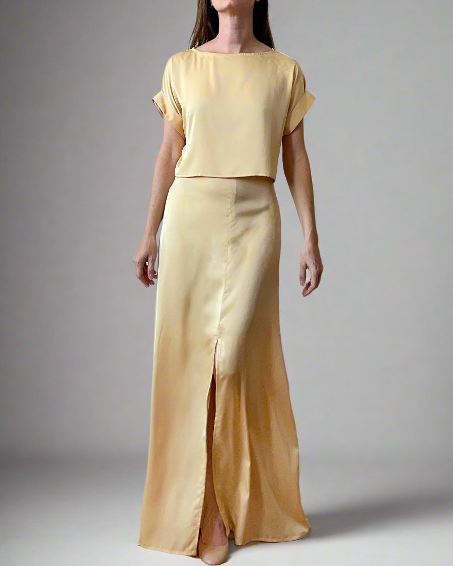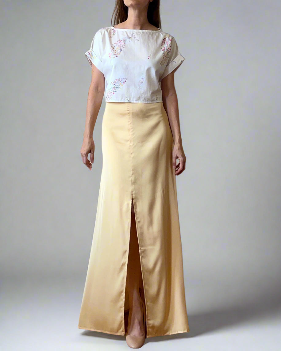 Álllítható derékszélességű lefele bővülő elől sliccelt maxi szoknya. A hátsó rész összehúzásával a saját derékméretedre állíthatod a szoknyát, előlről pedig letisztult képet mutat a fazon.